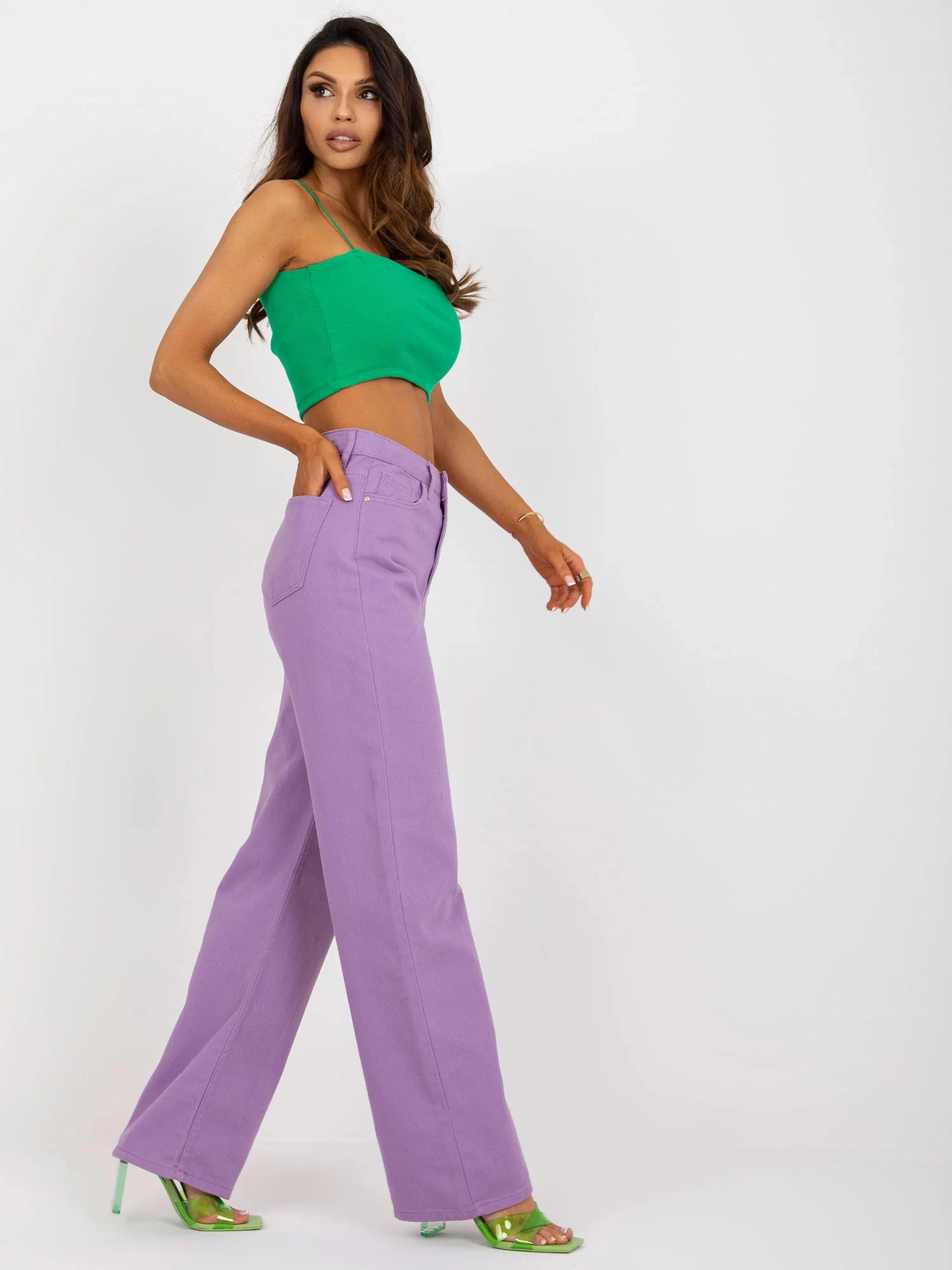 Fialové dámské džínové kalhoty s vysokým pasem .
