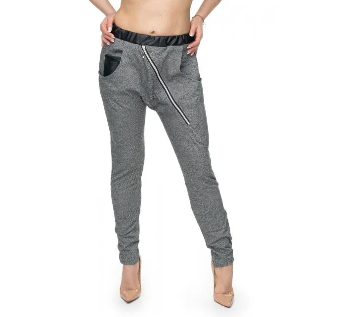 Kalhoty s ozdobným zipem. Kalhoty ve střihu buggy se zúženými nohavicemi. Přední kapsy, pásek z ekokůže.