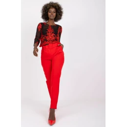 Dámské kalhoty s vysokým pasem, zipem a knoflíky. Kapsy na bocích. Pás je součástí dodávky.