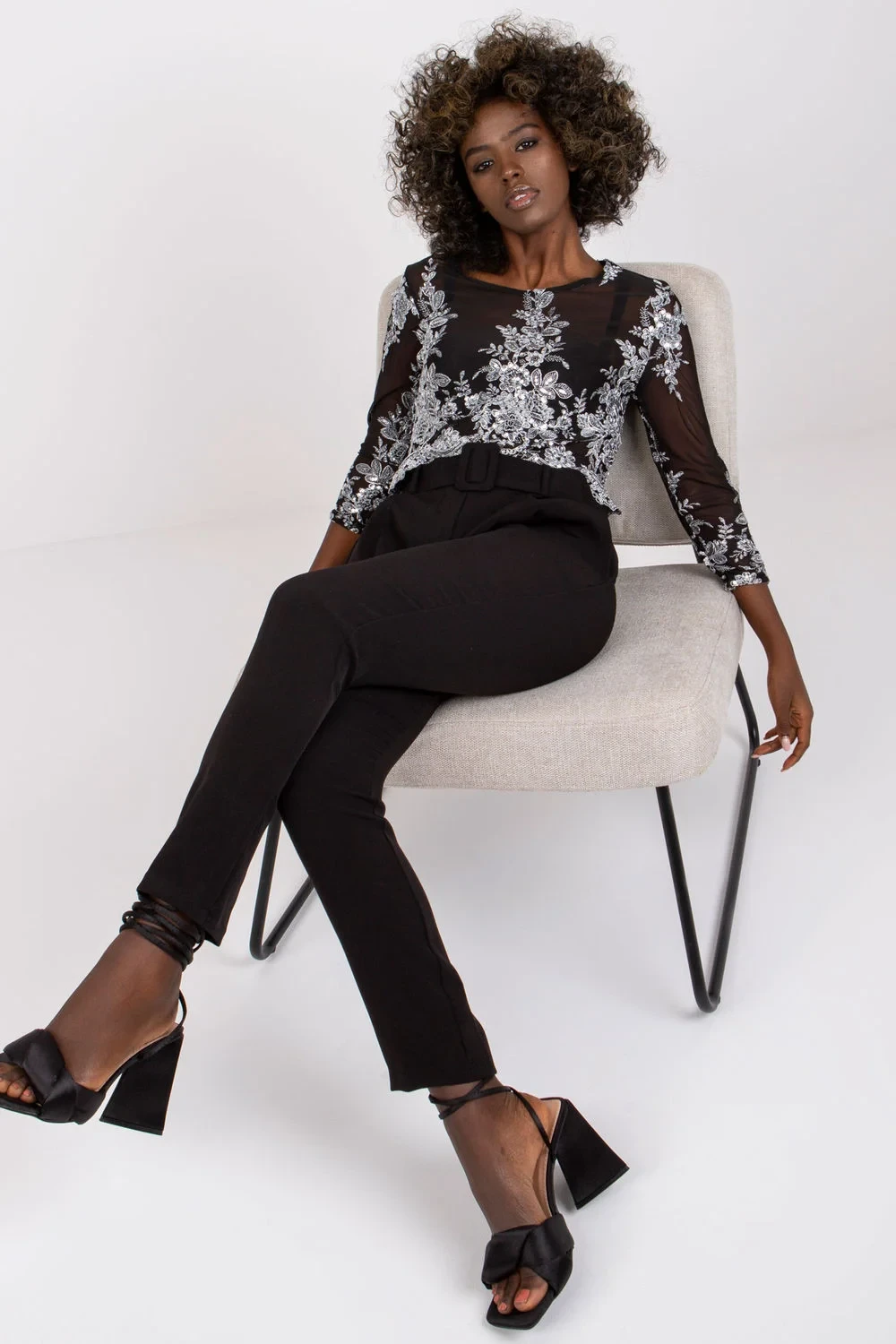 Dámské kalhoty s vysokým pasem, zipem a knoflíky. Kapsy na bocích. Pás je součástí dodávky.