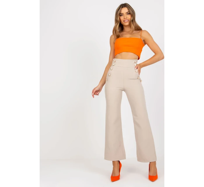 Dámské kalhoty s vysokým pasem a ozdobnými knoflíky na přední straně. Kalhoty s krytým zipem. Kalhoty s nakládanými kapsami.