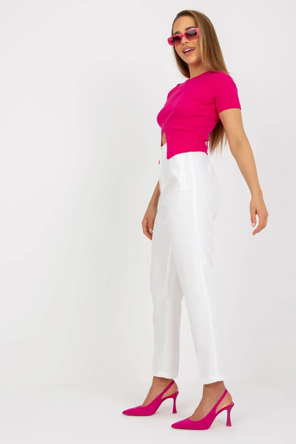 Kalhoty rovného střihu s vysokým pasem a zapínáním na zip. Imitace kapes na bocích. Ideální k různým outfitům.
