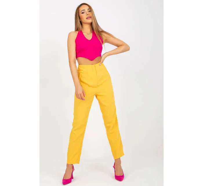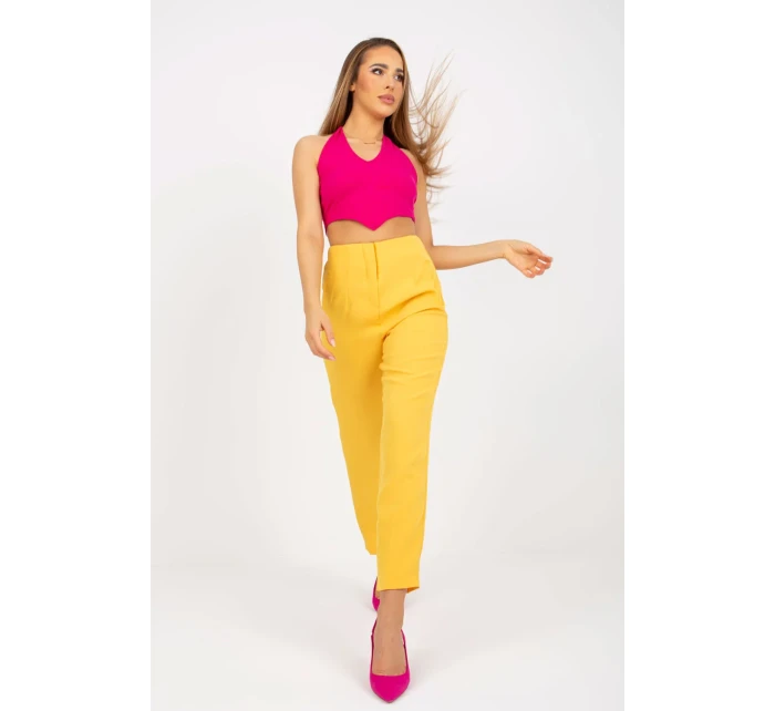 Kalhoty rovného střihu s vysokým pasem a zapínáním na zip. Imitace kapes na bocích. Ideální k různým outfitům.