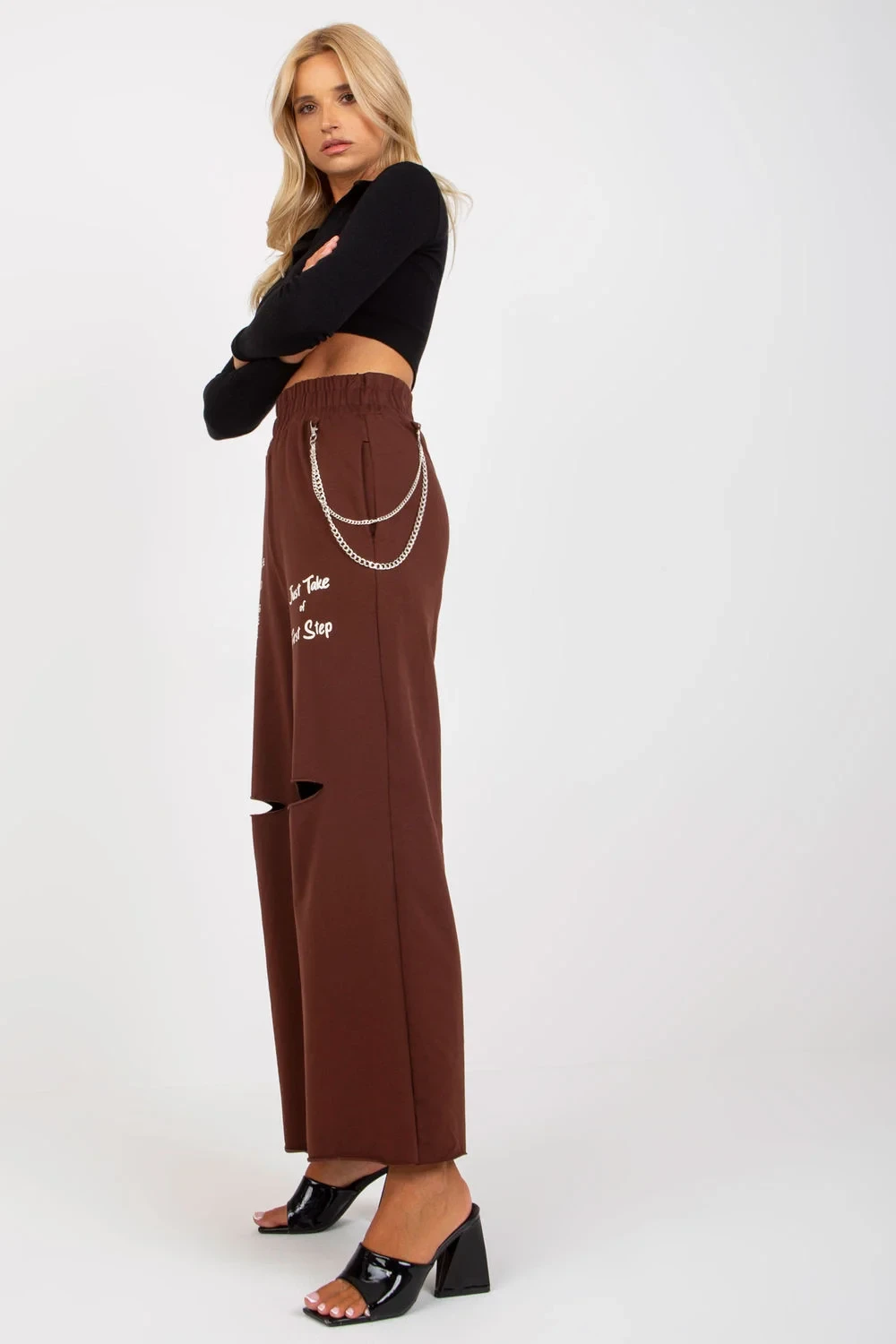 Tepláky se širokými nohavicemi, kapsami na bocích, elastickým pasem, ozdobnými rozparky a nápisem na přední straně. Odnímatelný řetízek.