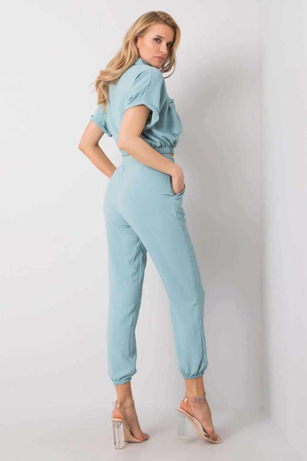 Dámský komplet sestávající z halenky a dlouhých kalhot. Halenka s krátkými rukávy a zapínáním na knoflíky. Kalhoty s elastickým pasem a kapsami na bocích.