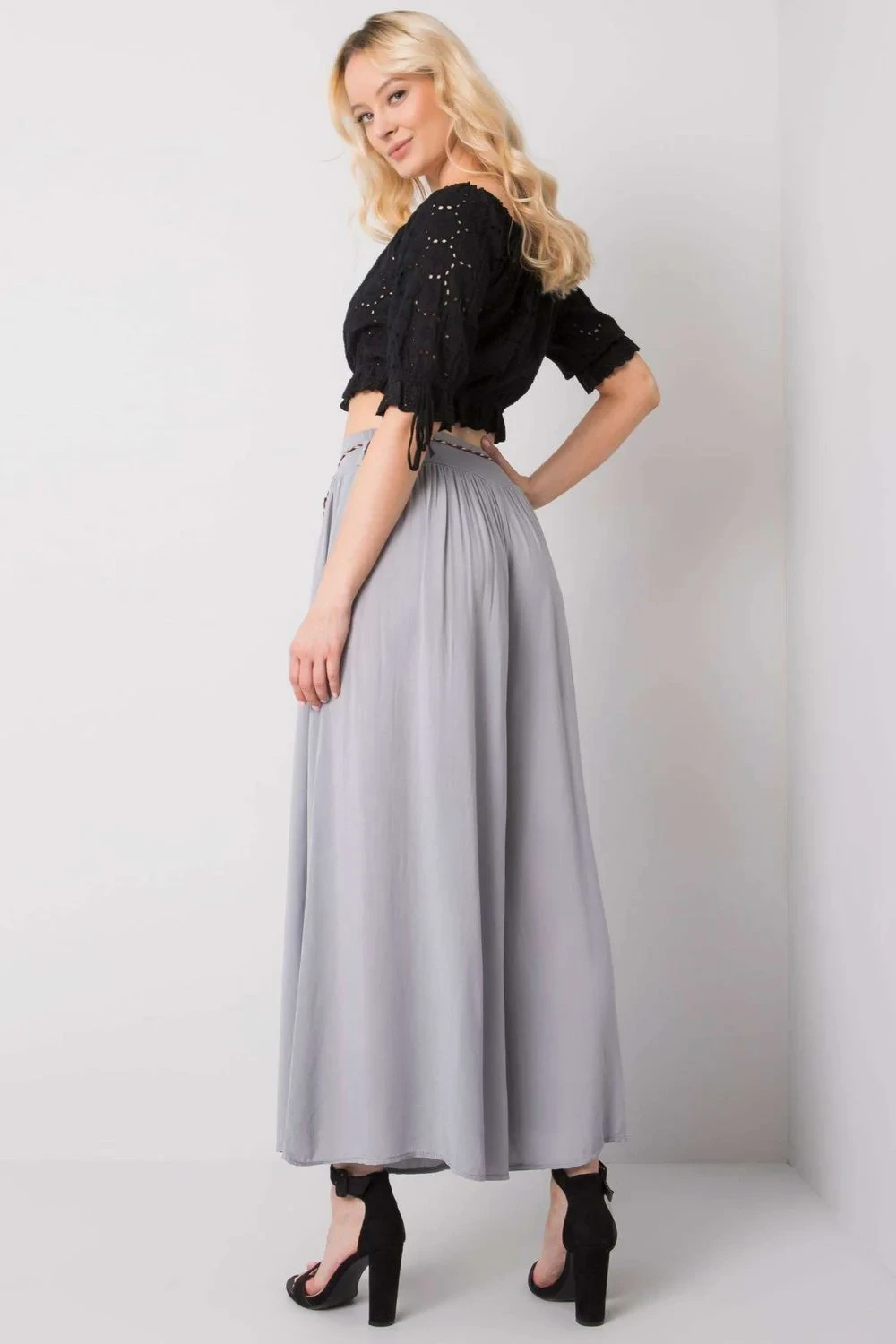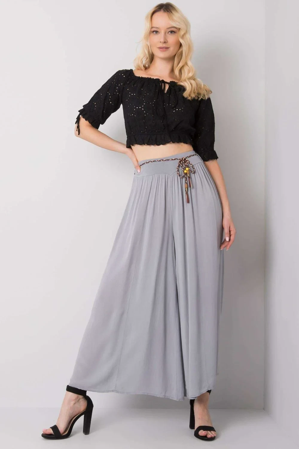 Látkové kalhoty se širokými nohavicemi, elastický pas. Kalhoty mají ozdobný pásek.