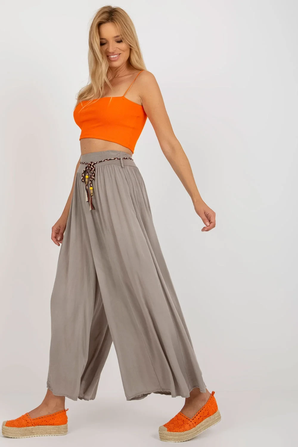 Látkové kalhoty se širokými nohavicemi, elastický pas. Kalhoty mají ozdobný pásek.