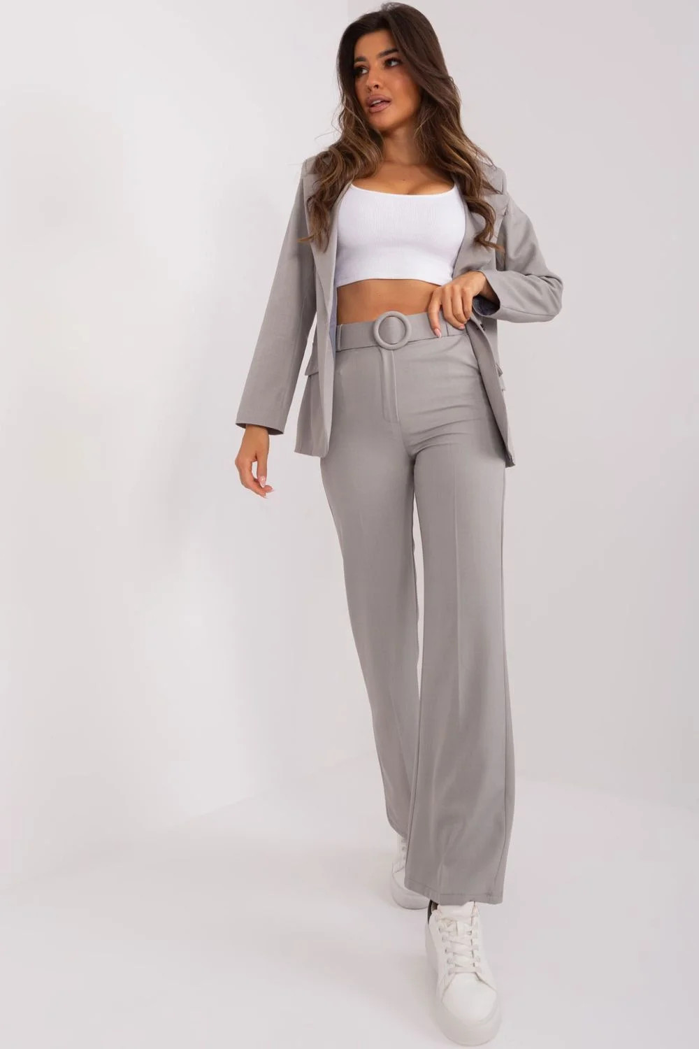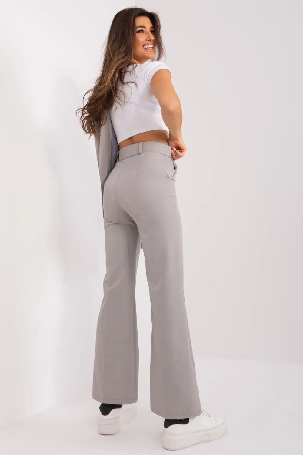 Dámské elegantní kalhoty jsou ideální volbou pro formální příležitosti, jako je práce nebo obchodní jednání. Jsou vyrobeny z vysoce kvalitního polyesteru, jsou hladké a lesklé a vypadají mimořádně elegantně. Jejich vysoký střih zdůrazňuje siluetu a dodává jim moderní vzhled. Rozšířené nohavice dodávají kalhotám lehkost a jemnost a dokonale doplňují elegantní vzhled. Zapínání na knoflík a zip zajišťuje, že kalhoty bezpečně drží na bocích, a zdůrazňuje tak jejich střih. Kapsy s patkami navíc dodávají kalhotám funkčnost a umožňují uložení drobných předmětů. Kalhoty jsou doplněny páskem, který plní nejen praktickou funkci, ale také dodává eleganci a zvýrazňuje pas. Tyto elegantní kalhoty jsou dokonalým doplňkem dámského šatníku a zaručují stylový vzhled a jistotu při důležitých událostech nebo pracovních schůzkách.