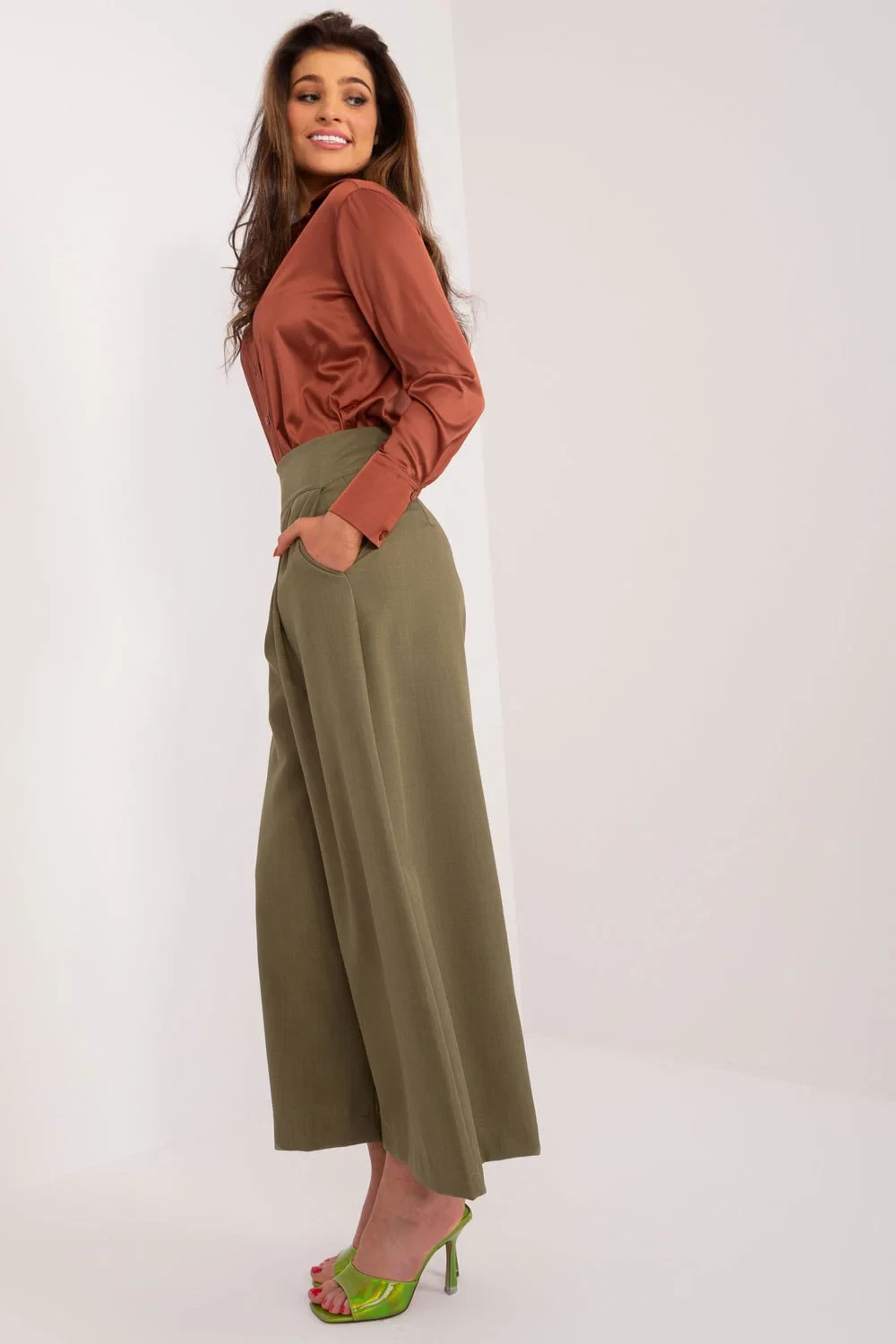 Dámské kalhoty culotte jsou dokonalou kombinací elegance a pohodlí, ideální pro různé příležitosti od každodenních situací až po obchodní schůzky nebo večerní vycházky. Vyznačují se hladkým vzorem, který jim dodává klasický a nadčasový vzhled. Díky vysokému pasu tyto kalhoty nejen zvýrazňují siluetu, ale také zajišťují pohodlné celodenní nošení. Široké nohavice jim dodávají lehkost a eleganci, takže jsou vhodnou volbou pro různá roční období. Skryté zapínání na zip poskytuje estetický vzhled a zároveň umocňuje elegantní charakter kalhot. Praktickým prvkem jsou boční nakládané kapsy, které dodávají funkčnost a volnost při používání. Kalhoty culotte jsou ideální pro každodenní nošení a vytvářejí stylizaci jak do práce, tak na neformální schůzky nebo večerní akce. Jejich univerzálnost umožňuje volně je kombinovat s různými prvky šatníku, což z nich činí nepostradatelnou součást dámského šatníku pro ženy, které si cení elegance a pohodlí.