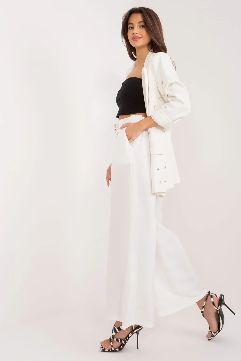 Dámské palazzo kalhoty jsou esencí elegance a pohodlí, ideální pro různé příležitosti, od každodenních schůzek až po formální výlety nebo události. Jsou vyrobeny z hladké polyesterové tkaniny, která zajišťuje vysoký komfort nošení a odolnost. Díky vysokému pasu kalhoty dokonale sedí na postavě, zdůrazňují její proporce a dodávají jí ženskou eleganci. Široké nohavice jim dodávají charakter a zdůrazňují jemnost a lehkost střihu. Praktické postranní kapsy poskytují pohodlné uložení drobných předmětů, díky čemuž jsou tyto kalhoty stylové i funkční. Kromě toho jsou kalhoty vybaveny elastickým pasem a páskem se sponou, který působí lehce a dodává jim šmrnc. Díky své univerzálnosti budou tyto palazzo kalhoty ideální pro nejrůznější situace, od každodenních povinností přes dny v práci až po večerní schůzky či akce. Jejich elegantní styl a výjimečné pohodlí z nich udělají oblíbenou součást šatníku každé ženy.