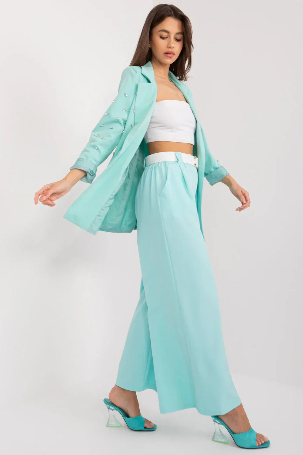 Dámské palazzo kalhoty jsou esencí elegance a pohodlí, ideální pro různé příležitosti, od každodenních schůzek až po formální výlety nebo události. Jsou vyrobeny z hladké polyesterové tkaniny, která zajišťuje vysoký komfort nošení a odolnost. Díky vysokému pasu kalhoty dokonale sedí na postavě, zdůrazňují její proporce a dodávají jí ženskou eleganci. Široké nohavice jim dodávají charakter a zdůrazňují jemnost a lehkost střihu. Praktické postranní kapsy poskytují pohodlné uložení drobných předmětů, díky čemuž jsou tyto kalhoty stylové i funkční. Kromě toho jsou kalhoty vybaveny elastickým pasem a páskem se sponou, který působí lehce a dodává jim šmrnc. Díky své univerzálnosti budou tyto palazzo kalhoty ideální pro nejrůznější situace, od každodenních povinností přes dny v práci až po večerní schůzky či akce. Jejich elegantní styl a výjimečné pohodlí z nich udělají oblíbenou součást šatníku každé ženy.