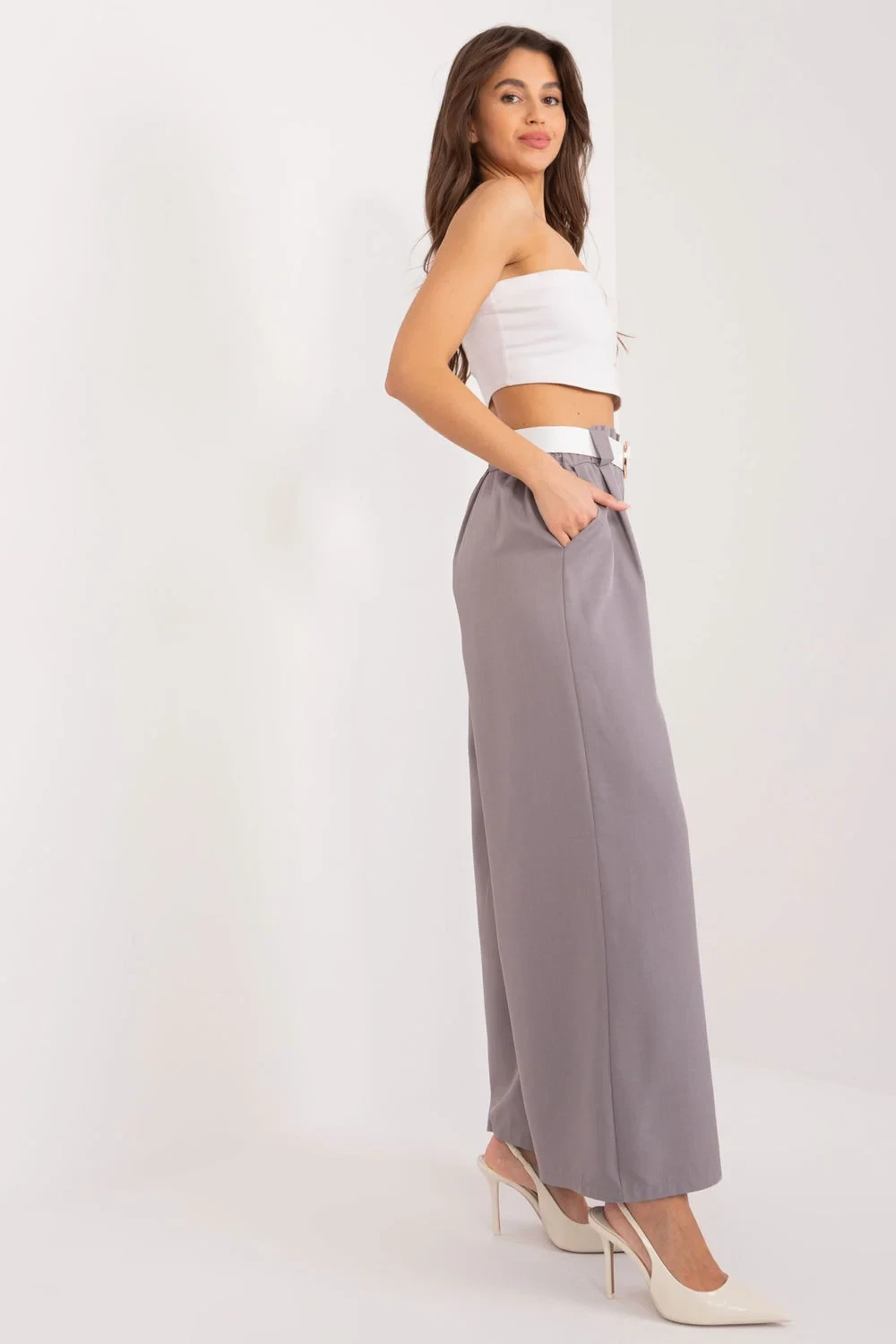 Dámské palazzo kalhoty jsou esencí elegance a pohodlí, ideální pro různé příležitosti, od každodenních schůzek až po formální výlety nebo události. Jsou vyrobeny z hladké polyesterové tkaniny, která zajišťuje vysoký komfort nošení a odolnost. Díky vysokému pasu kalhoty dokonale sedí na postavě, zdůrazňují její proporce a dodávají jí ženskou eleganci. Široké nohavice jim dodávají charakter a zdůrazňují jemnost a lehkost střihu. Praktické postranní kapsy poskytují pohodlné uložení drobných předmětů, díky čemuž jsou tyto kalhoty stylové i funkční. Kromě toho jsou kalhoty vybaveny elastickým pasem a páskem se sponou, který působí lehce a dodává jim šmrnc. Díky své univerzálnosti budou tyto palazzo kalhoty ideální pro nejrůznější situace, od každodenních povinností přes dny v práci až po večerní schůzky či akce. Jejich elegantní styl a výjimečné pohodlí z nich udělají oblíbenou součást šatníku každé ženy.