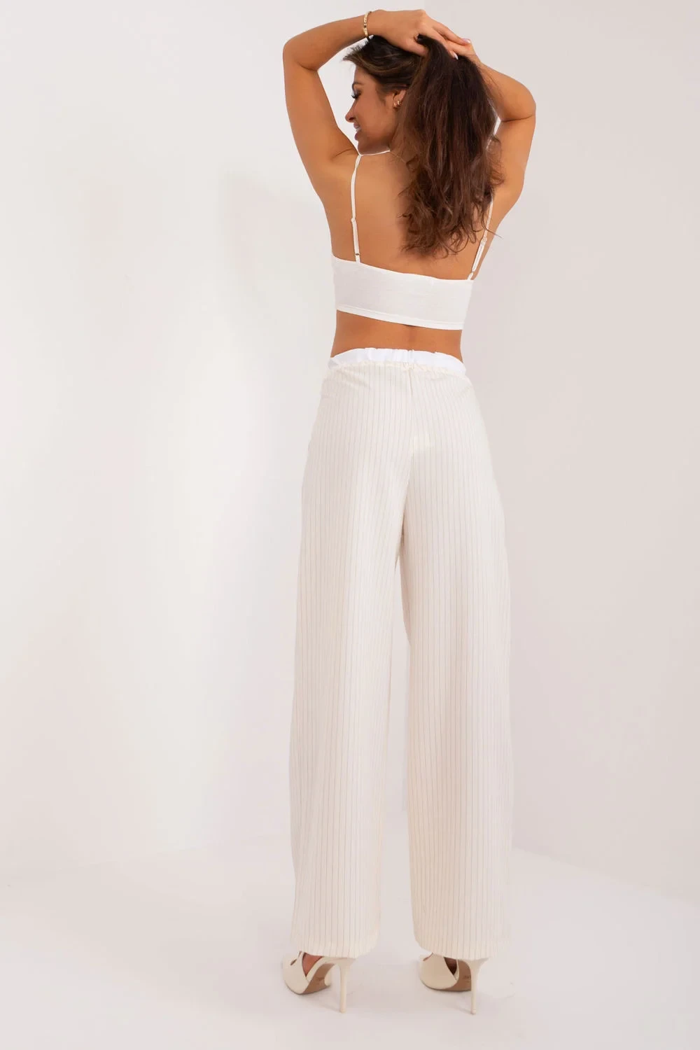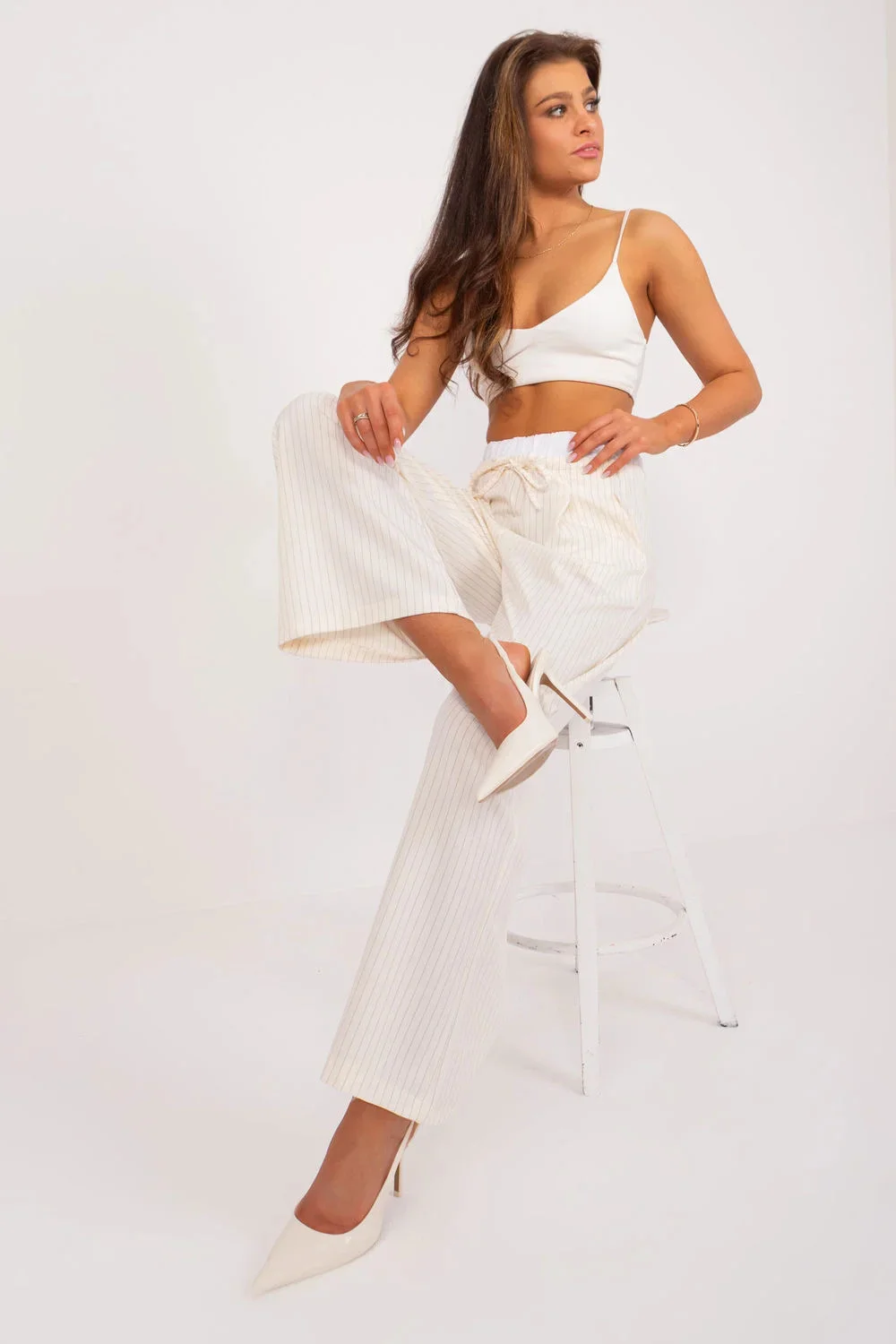 Tyto elegantní palazzo kalhoty jsou ideální volbou pro různé příležitosti, od každodenních situací až po formální události nebo večerní večírky. Jejich stylový design a kvalitní materiál z nich dělají spolehlivý základ pro nejrůznější vzhledy. Tyto kalhoty jsou vyrobeny převážně z polyesteru, jsou mimořádně odolné a nemačkavé, takže jsou ideální pro každodenní nošení i pro jarní/letní sezónu. Materiál s jemnými proužky jim dodává lehkost a jemnost, takže se hodí pro různé příležitosti. Jejich vysoký střih zdůrazňuje pas a dodává celkové siluetě eleganci. Široké nohavice ve stylu palazzo jim dodávají luxusní pocit a volnost pohybu, takže jsou pohodlnou volbou pro dlouhé dny v práci i večerní vycházky. Přední část kalhot je opatřena ozdobnými záševky, které dodávají kalhotám originalitu a jedinečný nádech. Kromě toho mají kalhoty zasouvací boční kapsy, které jsou praktickým doplňkem celkového designu. Palazzo kalhoty se zavazováním v pase umožňují upravit střih, díky čemuž dokonale padnou každé siluetě. Nechte tyto kalhoty, aby se staly nedílnou součástí vašeho šatníku a dodaly šik a eleganci každému outfitu, ať už se jedná o jakoukoli příležitost.