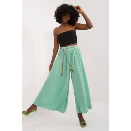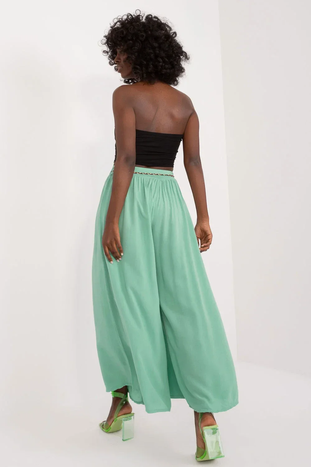 Viskózové kalhoty s vysokým pasem, elastický pás. Kalhoty se širokými nohavicemi, ozdobný pásek na zavázání.