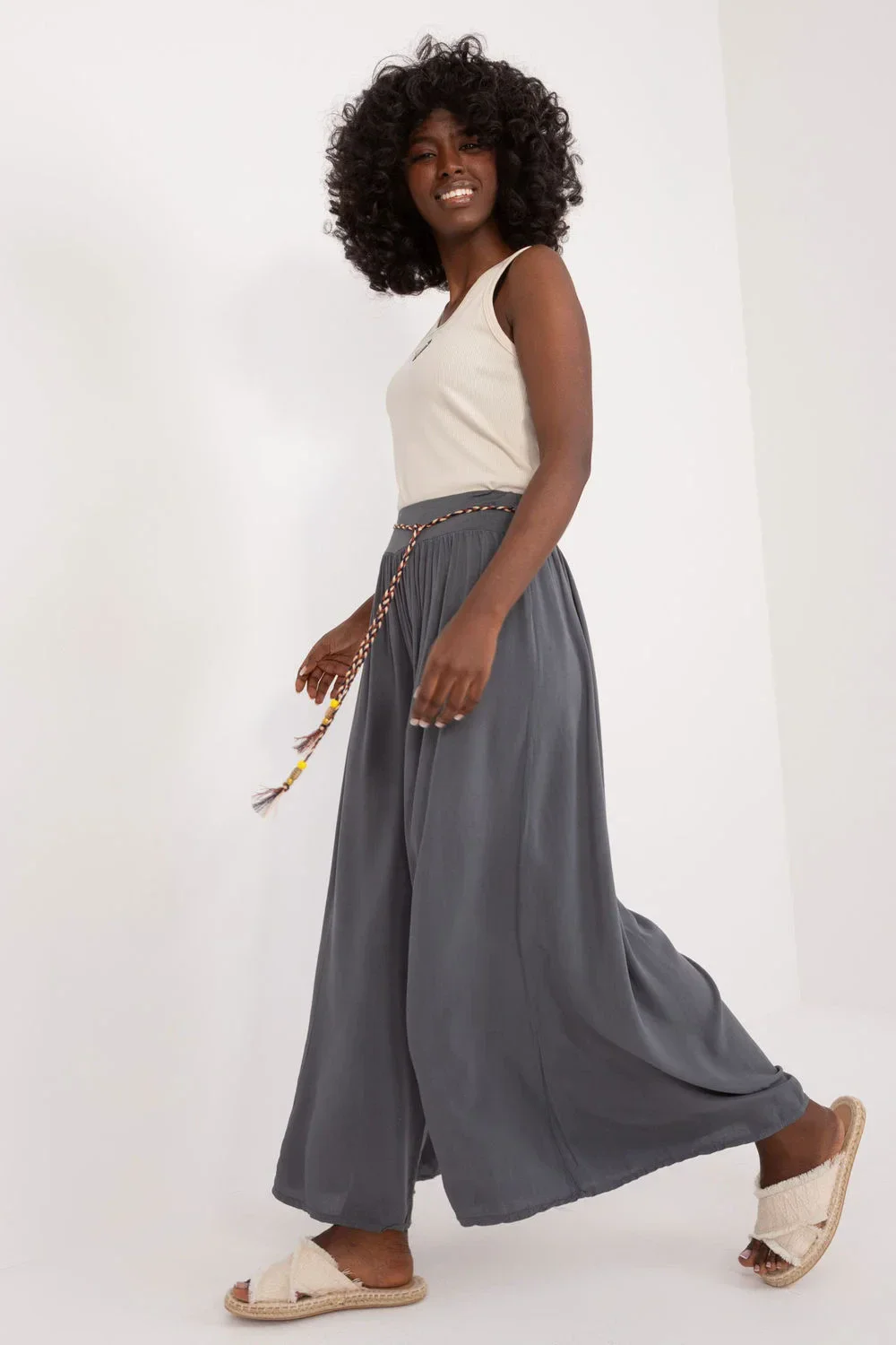 Viskózové kalhoty s vysokým pasem, elastický pás. Kalhoty se širokými nohavicemi, ozdobný pásek na zavázání.