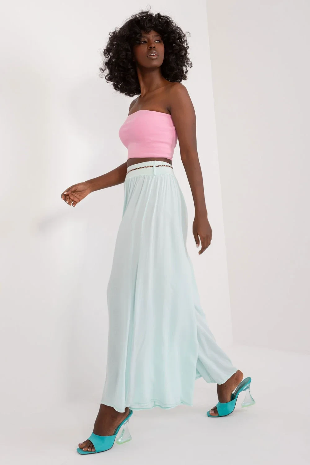 Viskózové kalhoty s vysokým pasem, elastický pás. Kalhoty se širokými nohavicemi, ozdobný pásek na zavázání.