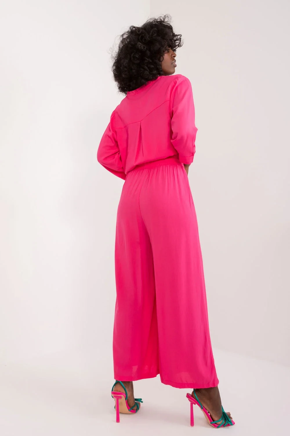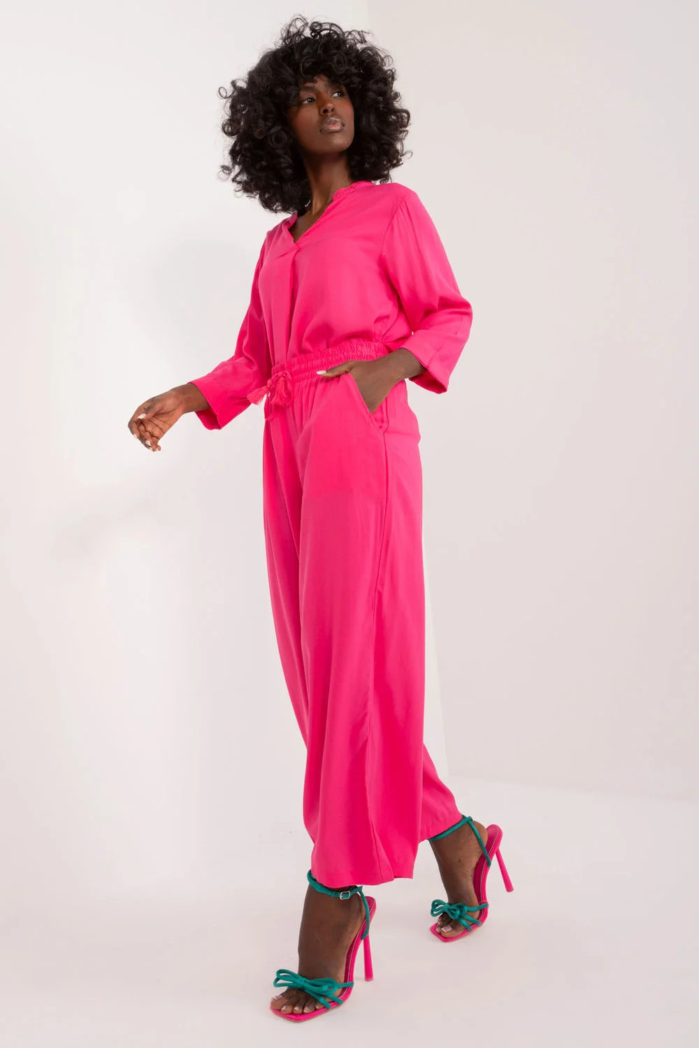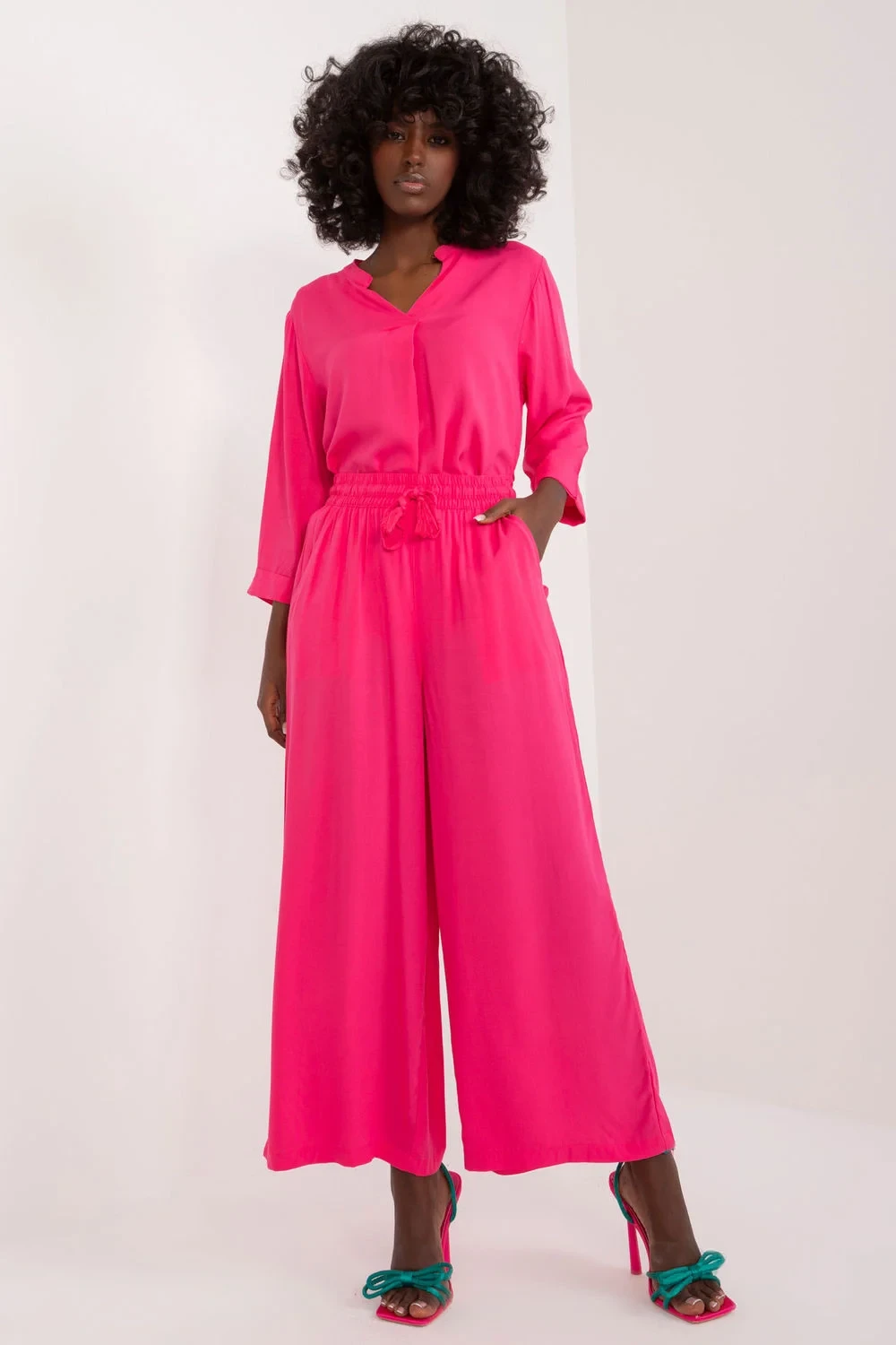 Široké nohavice palazzo jsou ideální volbou pro každodenní outfit, který spojuje pohodlí s elegancí. Vyrobené z viskózy, která zajišťuje měkkost a prodyšnost, se skvěle hodí jak na teplé dny, tak i při chladných večerech. Široké nohavice jim dodávají volný, ležérní vzhled, který skvěle zapadá do casual stylu. Další výhodou jsou praktické zapichovací kapsy, které zvyšují funkčnost kalhot. Vysoký pas zdůrazňuje pas a opticky prodlužuje postavu, díky čemuž jsou tyto kalhoty velmi výhodné pro každý typ postavy. Stahovací šňůrky na pasu umožňují ideální přizpůsobení, a absence zapínání zaručuje pohodlné nošení. Jednoduchý, jednobarevný design dělá tyto kalhoty víceúčelovým kusem oblečení, který lze snadno kombinovat s různými topy a doplňky. Jedná se o univerzální nabídku pro ženy, které si cení módy a pohodlí každý den.