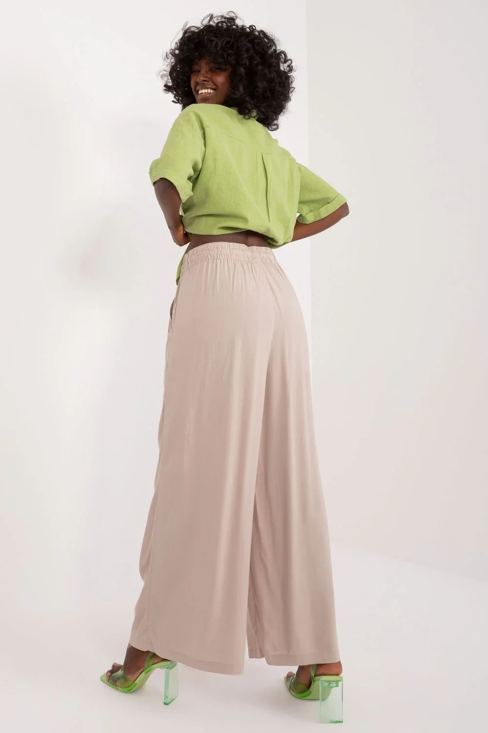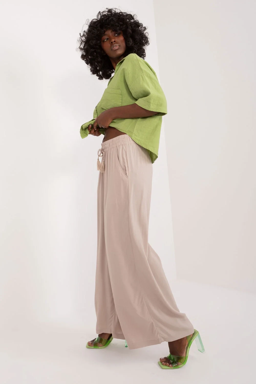 Kalhoty palazzo jsou ideální volbou pro každodenní outfit, kombinující pohodlí s elegancí. Jsou vyrobeny z viskózy, která zajistí měkkost a prodyšnost, a proto se skvěle hodí jak na teplé dny, tak na chladnější večery. Široké nohavice dodávají volný a nonšalantní vzhled, který skvěle zapadá do ležérního stylu. Další výhodou jsou praktické zapichovací kapsy, které zvyšují funkčnost kalhot. Vysoký pas zdůrazňuje pas a opticky prodlužuje siluetu, což činí tyto kalhoty velmi výhodnými pro každou postavu. Šňůrky na stahování umožňují ideální přizpůsobení pasu a absence zapínání zaručuje pohodlí při nošení. Jednoduchý a jednobarevný design činí z těchto kalhot všestranný kus oblečení, který lze snadno kombinovat s různými tílky a doplňky. Jedná se o univerzální návrh pro ženy, které si cení módy a pohodlí ve svém každodenním životě.