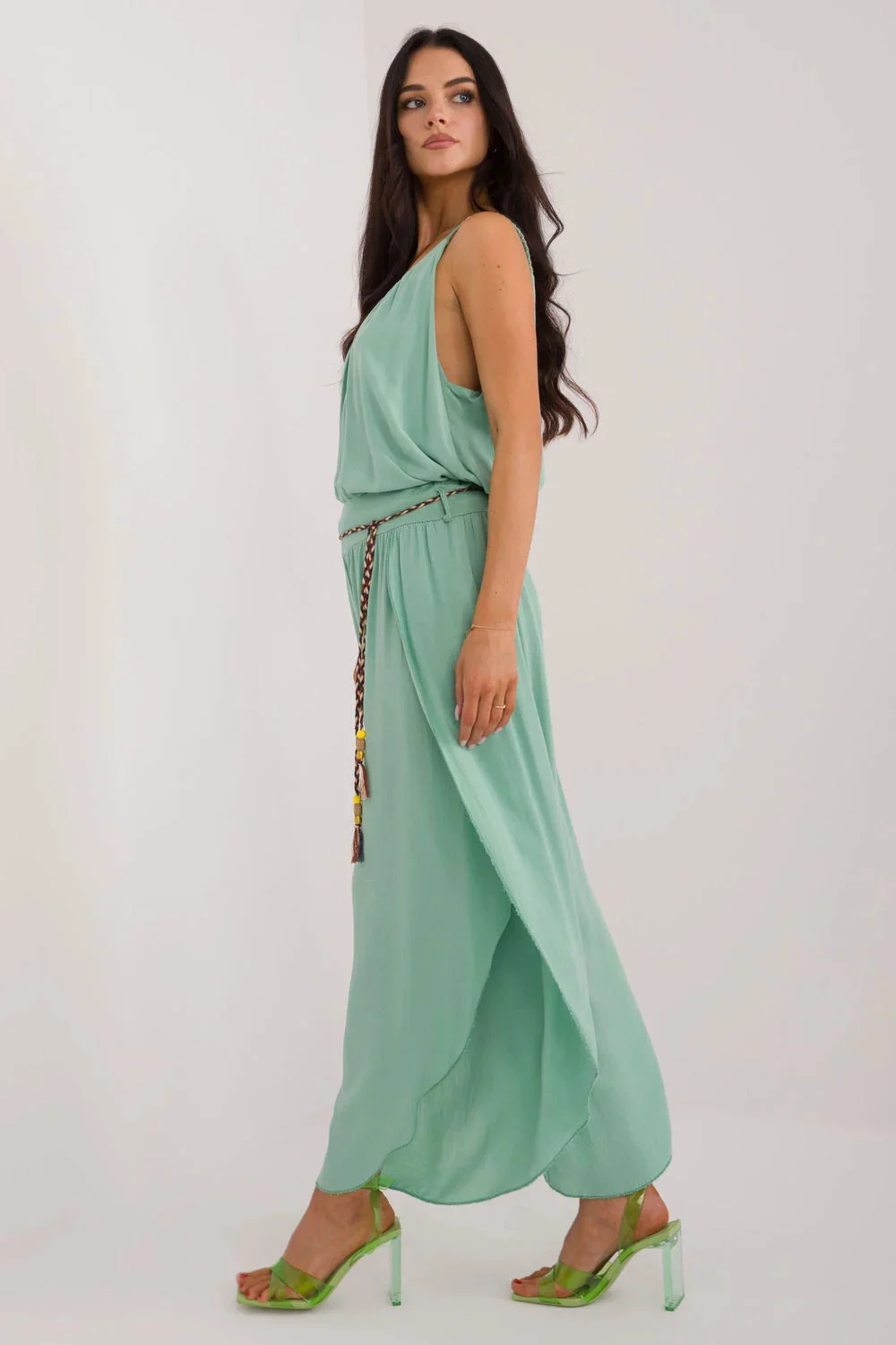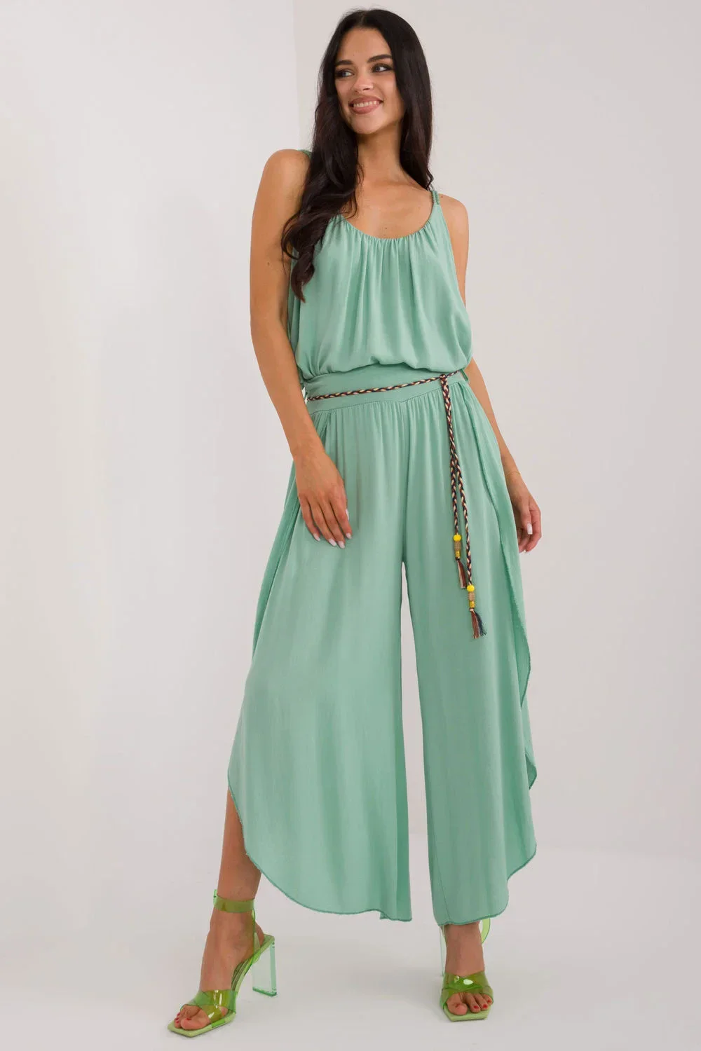 Kalhoty se švem jsou ideální volbou pro každodenní nošení. Jsou vyrobeny z hladké tkaniny, mají vysoký pas, který zvýrazňuje pas a zajišťuje pohodlné nošení. Jejich široké nohavice s rozparkem dodávají lehkost a volnost pohybu. Kalhoty mají v pase zavazování pro dokonalé přizpůsobení. Mají minimalistický design bez kapes, což jim dodává na eleganci a jednoduchosti. Kalhoty se švy v boho stylu, které jsou ideální pro neformální setkávání i každodenní nošení, jsou pohodlným a módním kouskem šatníku.