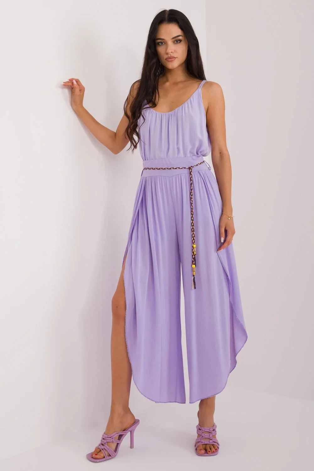 Kalhoty se švem jsou ideální volbou pro každodenní nošení. Jsou vyrobeny z hladké tkaniny, mají vysoký pas, který zvýrazňuje pas a zajišťuje pohodlné nošení. Jejich široké nohavice s rozparkem dodávají lehkost a volnost pohybu. Kalhoty mají v pase zavazování pro dokonalé přizpůsobení. Mají minimalistický design bez kapes, což jim dodává na eleganci a jednoduchosti. Kalhoty se švy v boho stylu, které jsou ideální pro neformální setkávání i každodenní nošení, jsou pohodlným a módním kouskem šatníku.
