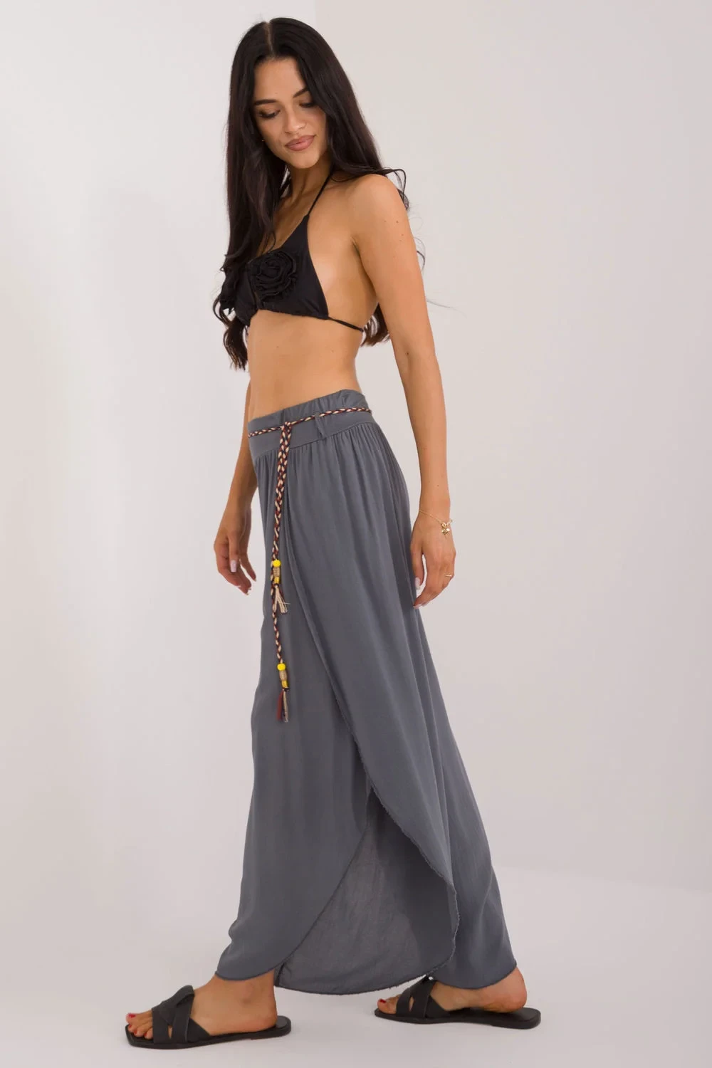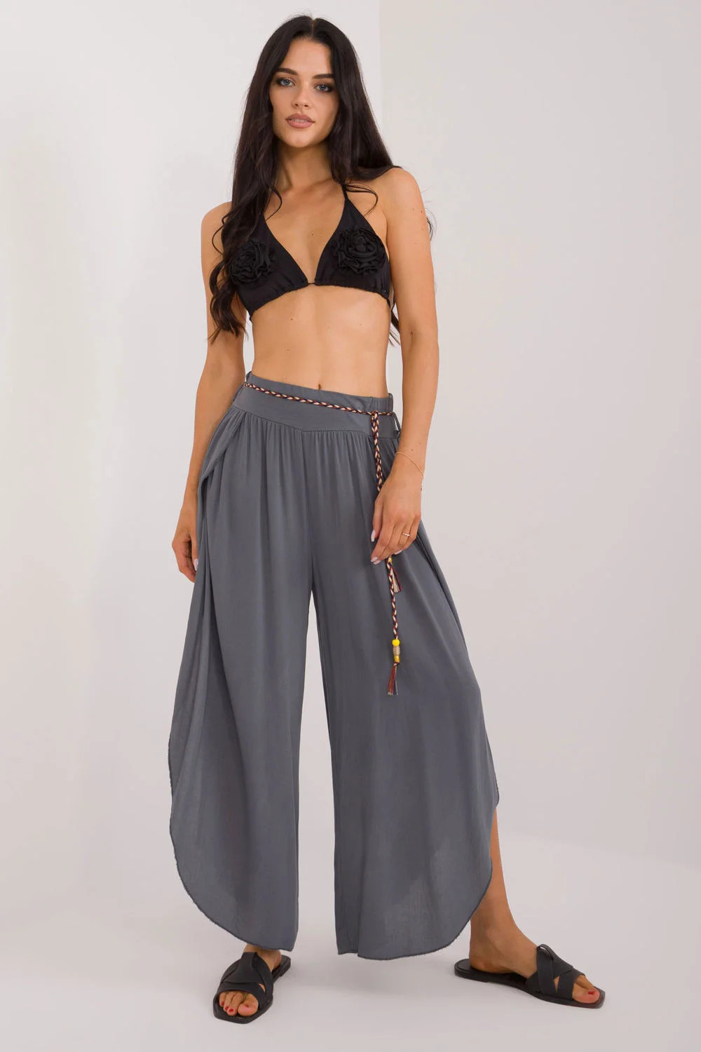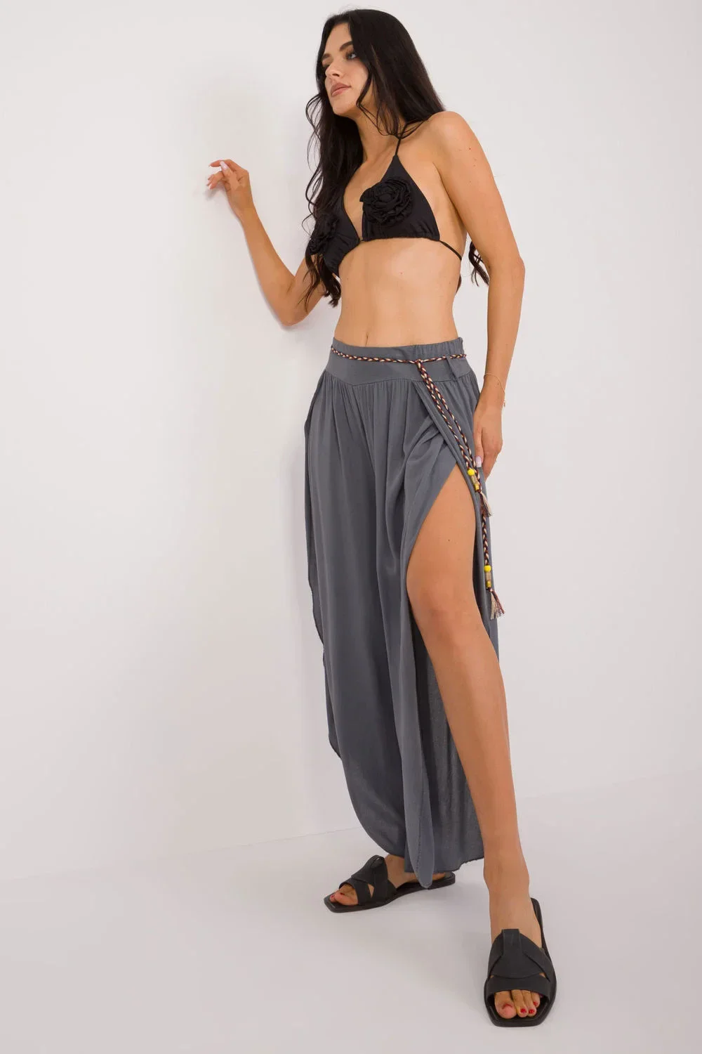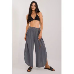 Kalhoty se švem jsou ideální volbou pro každodenní nošení. Jsou vyrobeny z hladké tkaniny, mají vysoký pas, který zvýrazňuje pas a zajišťuje pohodlné nošení. Jejich široké nohavice s rozparkem dodávají lehkost a volnost pohybu. Kalhoty mají v pase zavazování pro dokonalé přizpůsobení. Mají minimalistický design bez kapes, což jim dodává na eleganci a jednoduchosti. Kalhoty se švy v boho stylu, které jsou ideální pro neformální setkávání i každodenní nošení, jsou pohodlným a módním kouskem šatníku.