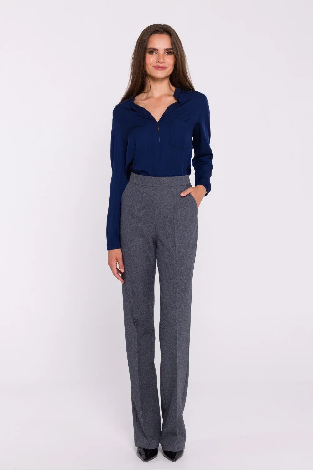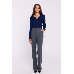 Elegantní dámské tkané kalhoty, které se vyznačují rozšířenými nohavicemi ve spodní části, jež dodávají siluetě lehkost a prodlužují nohy. Lisovaný okraj zdůrazňuje jejich klasický a rafinovaný charakter, ideální pro pracovní i formální příležitosti. Kalhoty mají vysoký náplet, který krásně zvýrazňuje pas, zatímco krytý zip v zadní části zajišťuje hladké a diskrétní zapínání. Jsou navrženy a ušity v Polsku a kombinují vynikající kvalitu zpracování s módním, ženským střihem.