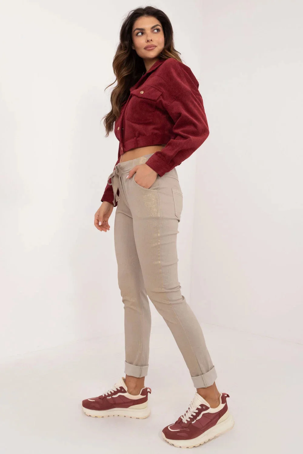 Dámské kalhoty z lesklé látky, ideální pro každodenní nošení i do práce. Jsou vyrobeny z měkké směsi viskózy, nylonu a elastanu a nabízejí pohodlí a pružnost. Díky ležérnímu stylu se skvěle hodí k různým outfitům. Středně vysoký střih se zavazováním v pase umožňuje přizpůsobení střihu, zatímco zúžené nohavice jim dodávají moderní a elegantní vzhled. Hladký vzor podtrhuje jejich jednoduchost, zatímco praktické postranní kapsy dodávají funkčnost. Jsou univerzálním kouskem šatníku, který lze úspěšně kombinovat s různými svršky a doplňky.
