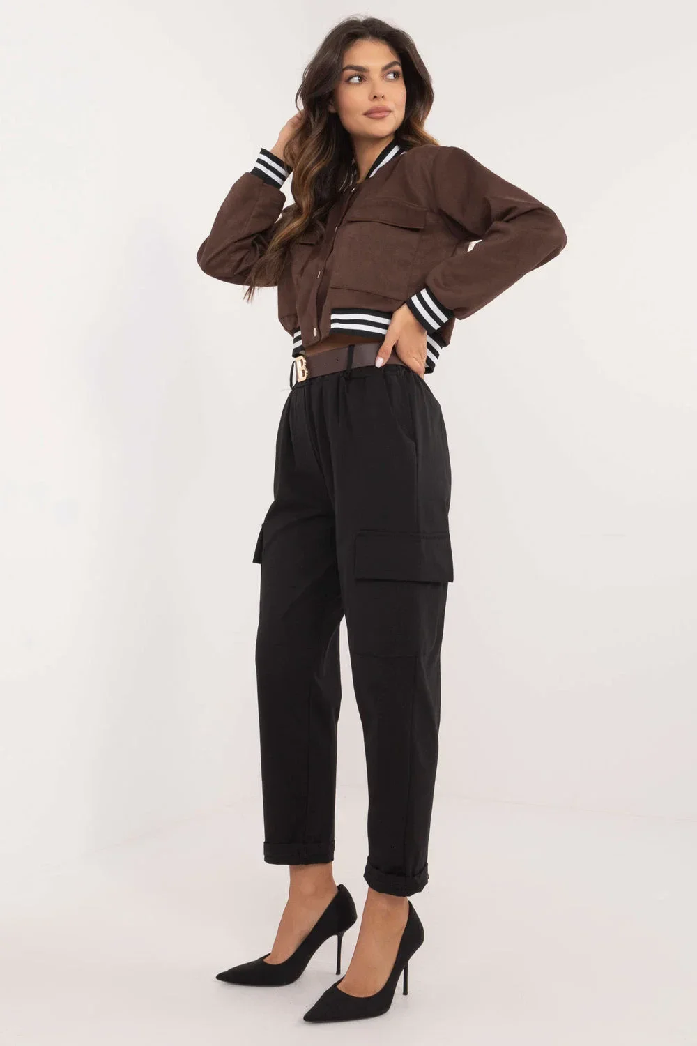 Dámské cargo kalhoty s volným charakterem, ideální jak pro každodenní nošení, tak i do práce. Vyrobené z směsi bavlny, polyamidu a elastanu, poskytují pohodlí a volnost pohybu. Hladký vzor dominuje, dodávající kalhotám univerzální, stylový vzhled. Vysoký pas a sevřené nohavice zdůrazňují siluetu a přidávají celkově elegantní charakter. Kalhoty jsou vybaveny praktickým, zapínacím páskem, který umožňuje ideální přizpůsobení pasu. Boční kapsy zdůrazňují jejich funkčnost a cargo styl, činíce je skvělou volbou na každou příležitost.