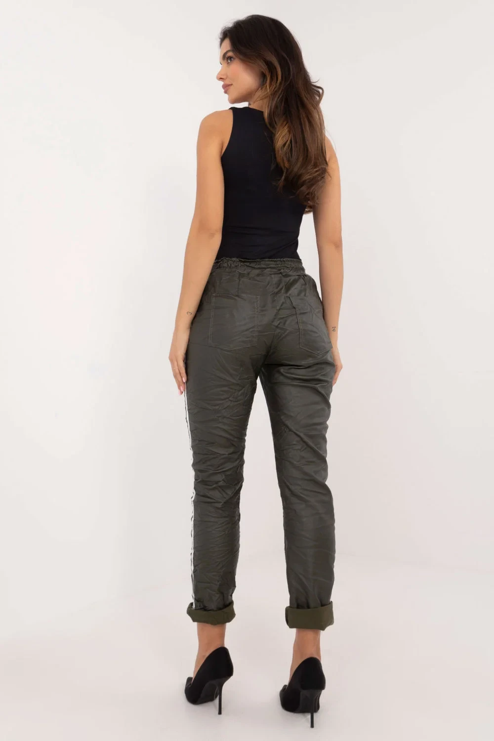 Dámské kalhoty z ekokože jsou skvělou volbou pro milovnice casual stylu, ideální na každodenní nošení i do práce. Vyrobené z vysoké kvality směsi viskózy, polyesteru a elastanu, poskytují pohodlí a pružnost, a jejich hladký vzor jim dodává moderní charakter. Vysoký pas skvěle zdůrazňuje pas, a sevřené nohavice opticky prodlužují postavu. Kalhoty jsou vybaveny praktickými bocími kapsami, ideálními pro ukládání drobností. Navíc, šňůrka v páse umožňuje individuální přizpůsobení, a stylové pruhy po stranách nohavic dodávají celku sportovní, ale zároveň elegantní vzhled. Jedná se o univerzální kousek šatníku, který lze kombinovat s různými topy a doplňky, vytvářející jedinečné outfit.