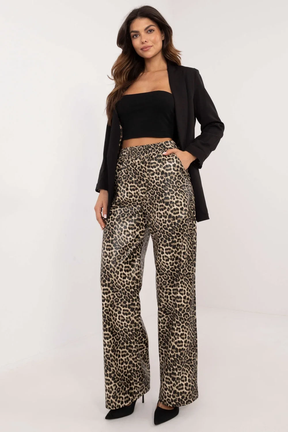 Kalhoty z ekokože v casualovém a elegantním stylu, ideální na každý den i do práce. Vyrobené z kombinace polyesteru a elastanu, poskytují pohodlí nošení a pružnost, a jejich vysoký pas zdůrazňuje pas. Dominantní zvířecí motiv dodává originalitu a módní akcent. Kalhoty mají rovné nohavice, co je činí univerzální a snadno kombinovatelné s různými stylizacemi. Bez zapínání a gumový pas zajišťují pohodlí a snadné oblékání, a boční vložené kapsy přidávají funkcionalitu. Ideální volba pro ty, kteří si cení stylu a pohodlí!