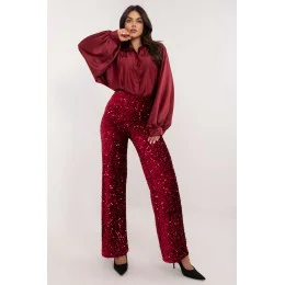 Elegantní látkové kalhoty s flitry, navržené na speciální příležitosti, jako jsou slavnostní události a večírky. Vyrobené z kombinace polyesteru a elastanu, kalhoty zajistí pohodlné přiléhání a jemný lesk díky aplikaci flitrů, která jim dodává výraz. Model s přímými nohavicemi a vysokým pasem decentně prodlužuje postavu. Bez zapínání a kapes dává celku hladký, minimalistický vzhled, a jemná podšívka zajistí pohodlí při nošení. Tyto kalhoty jsou ideální volbou, pokud chcete outfitu přidat elegantní, efektní akcent.