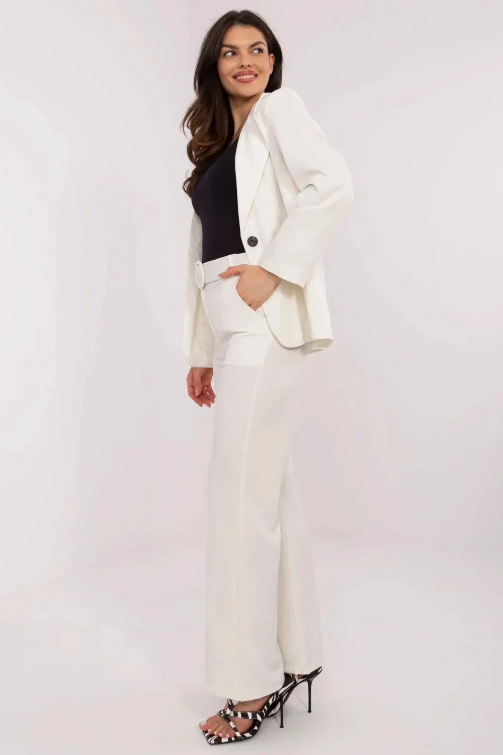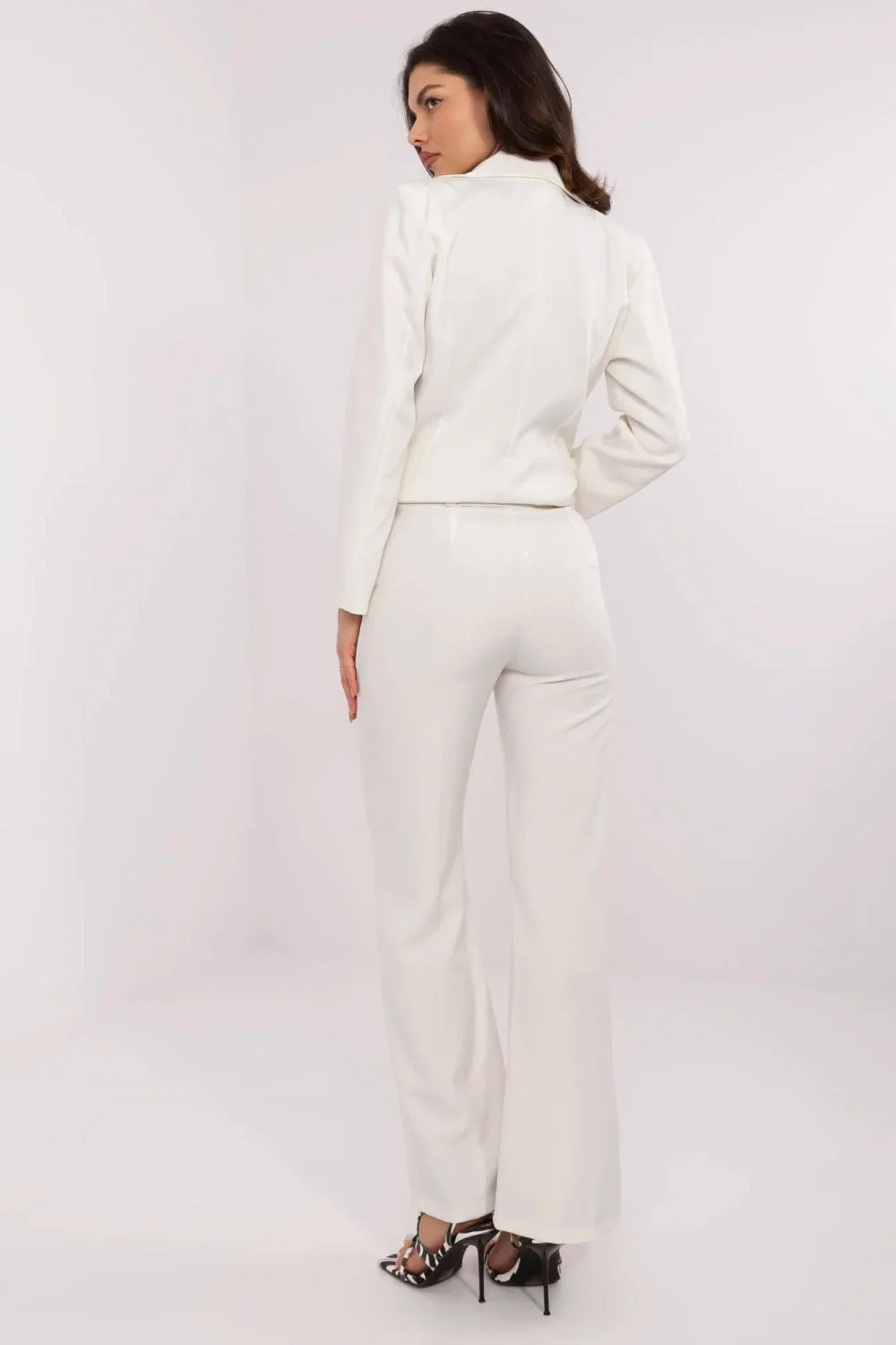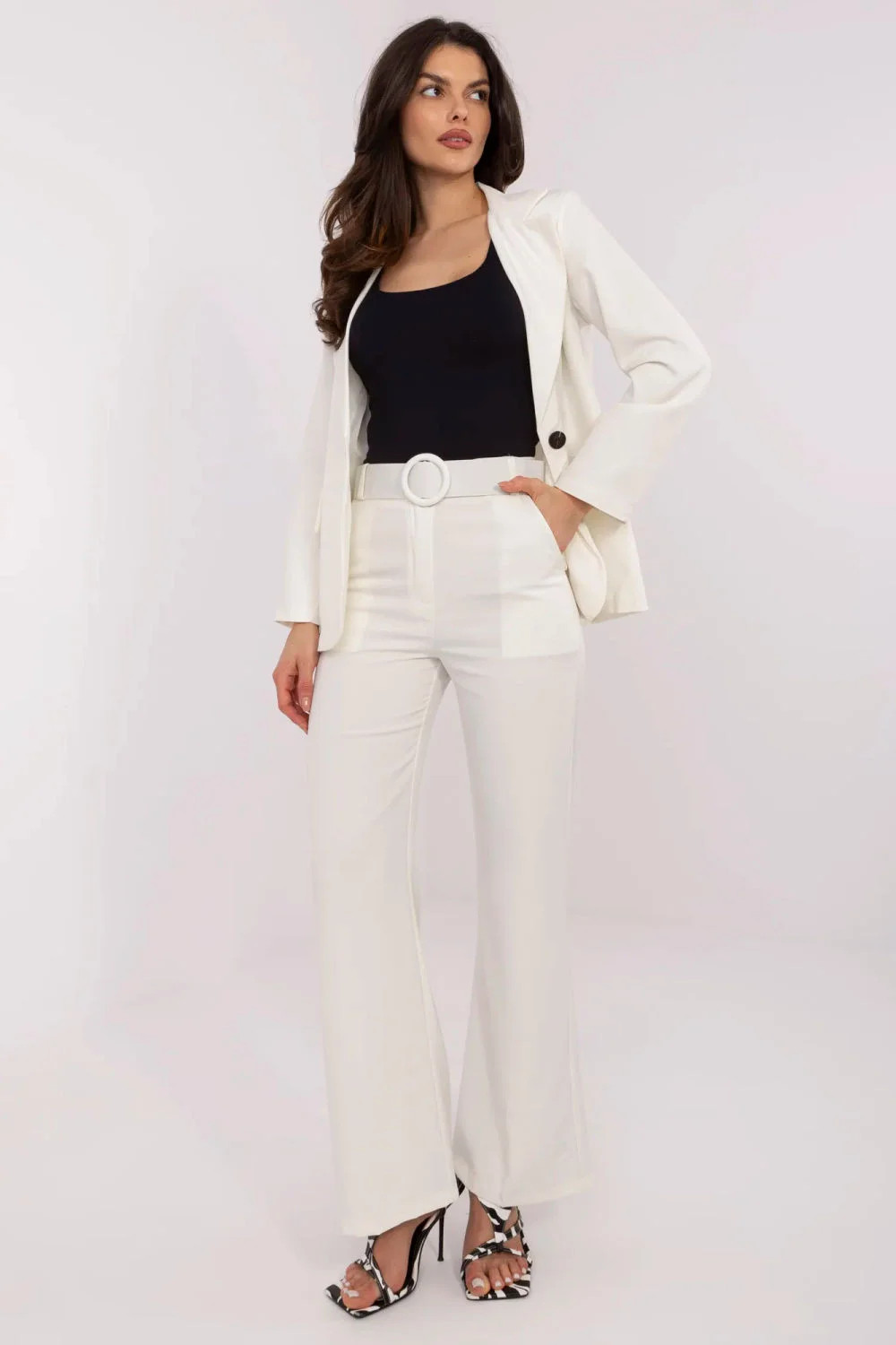 Dámské elegantní kalhoty jsou skvělou volbou pro formální události, jako je práce nebo obchodní schůzky. Vyráběné z vysoce kvalitního polyesteru, hladké a lesklé, působí neuvěřitelně elegantně. Jejich vysoký pas zdůrazňuje postavu a dodává jim moderní charakter. Rozšiřující se nohavice ke spodu dodávají kalhotám lehkost a jemnost, skvěle ladí s elegantním vzhledem. Zapínání na knoflík a zip zajišťuje pevné držení kalhot na bocích, zdůrazňující jejich přizpůsobivost. Navíc kapsy dodávají funkčnost, umožňující ukládání drobných předmětů. K soupravě jsou přiloženy pásky, které nejen plní praktickou funkci, ale také přidávají eleganci a zdůrazňují pas. Tyto elegantní kalhoty jsou skvělým doplněním ženského šatníku, zaručujícím stylový vzhled a sebejistotu během důležitých událostí nebo pracovních setkání.