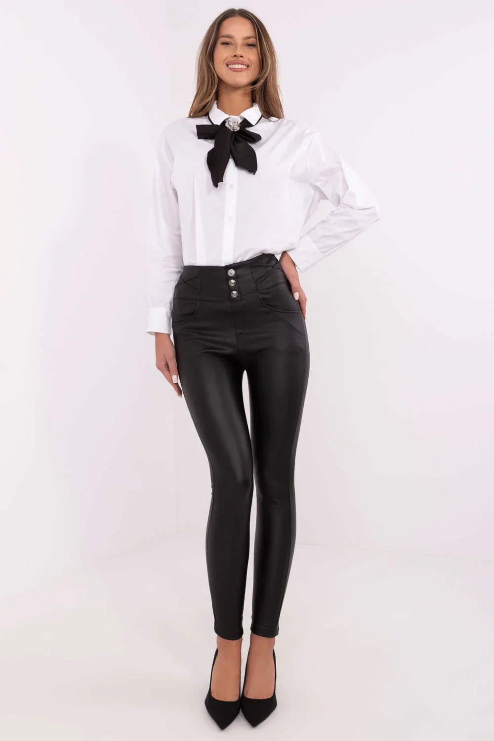 Dámské rourové kalhoty z ekokože jsou stylovým návrhem pro ženy, které ocení pohodlí a módní vzhled. Vyrobené z elastického materiálu, který kombinuje polyamid, elastan a polyester, skvěle padnou k postavě, zdůrazňují její přednosti. Hladký vzor a ležérní styl dělají tyto kalhoty skvělým doplňkem k každodenním outfitům. Vysoký pas zeštíhlí pas, a zužující nohavice dodávají elegantní, ženský charakter. Model nemá klasické zapínání, což zvyšuje pohodlí nošení, a otevřené kapsy dodávají funkčnost. Zateplení zase zajišťuje, že kalhoty perfektně poslouží v chladnějších dnech, a ozdobné knoflíky na přední straně jim dodávají výjimečný styl.