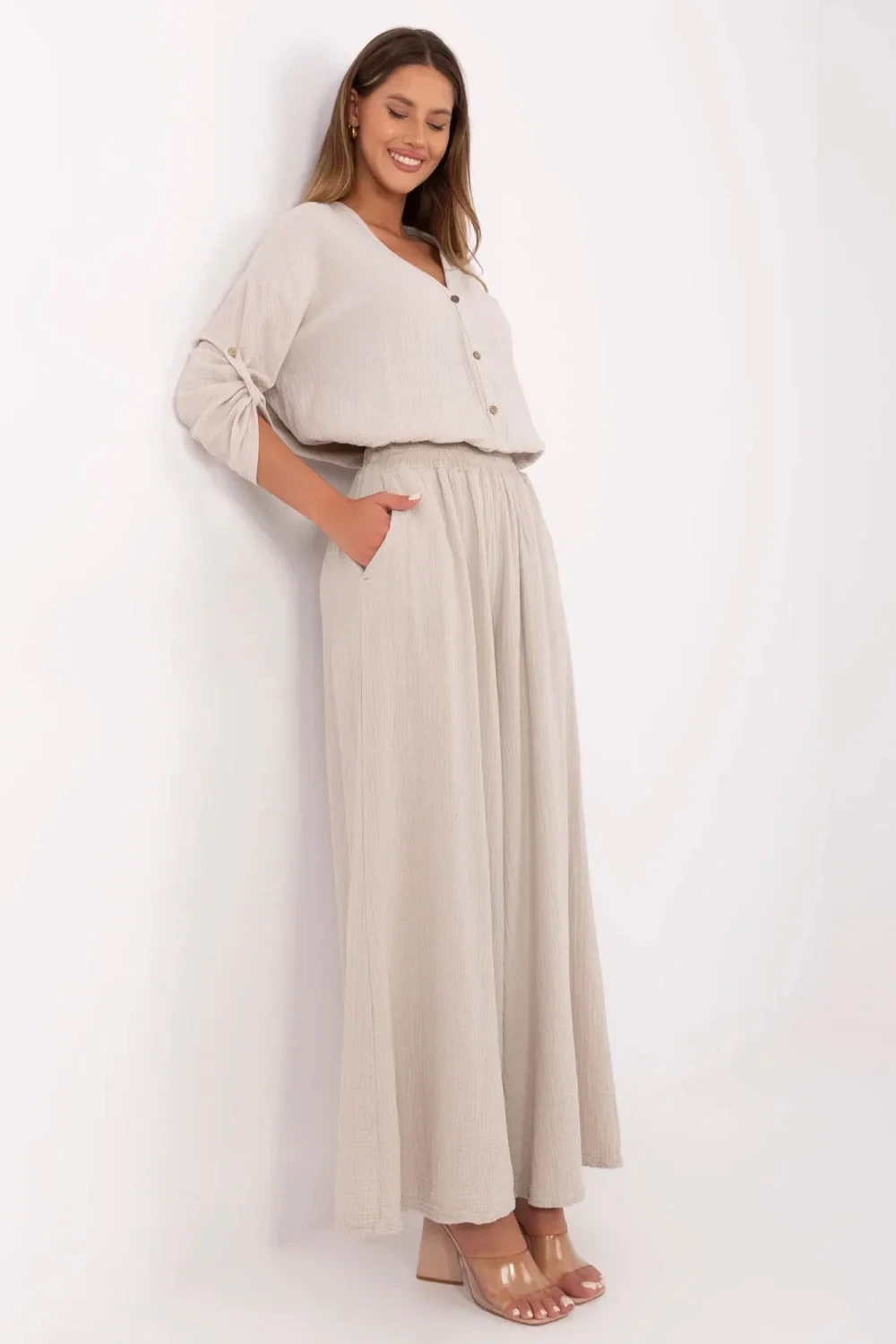 Lehké a stylové dámské kalhoty z mušelínu jsou ideální volbou na teplé dny. Vyrobené z prodyšné bavlny zaručují pohodlí nošení a přirozenou volnost pohybů. Střih palazzo s širokými nohavicemi jim dodává elegantní a zároveň ležérní charakter, ideální na každý den. Elastický pás zajistí pohodlné přizpůsobení, zdůrazňující pas a zvyšující pohodlí nošení. Boční kapsy s průchodem přidávají praktičnost a hladký vzor dělá kalhoty univerzální a snadné na stylování. Skvěle ladí jak s přiléhavým topem, tak s volnější košilí, vytvářejí lehké a trendy sestavy na různé příležitosti.