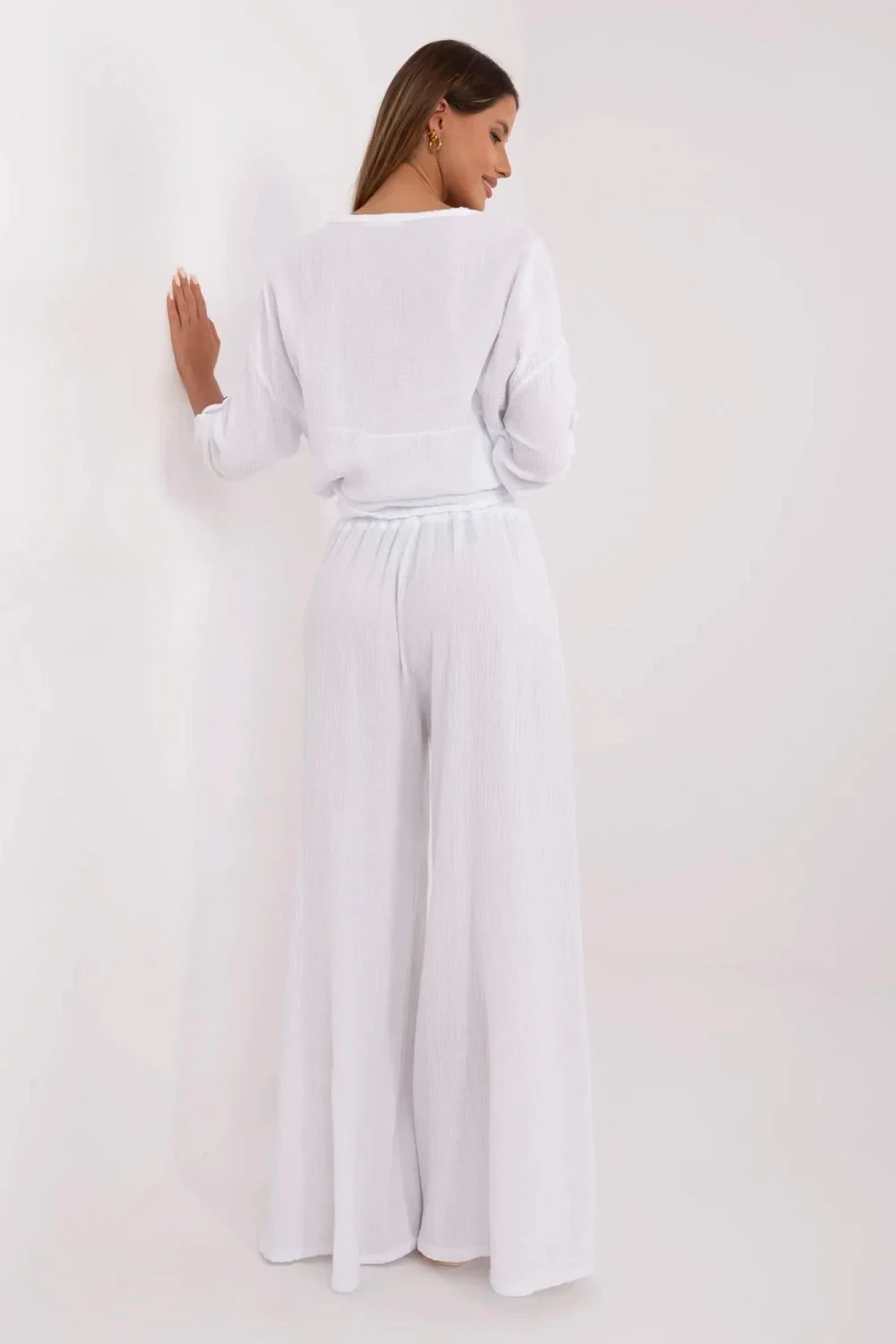 Lehké a stylové dámské mušelínové kalhoty jsou ideální volbou na teplé dny. Vyrobené z prodyšné bavlny zaručují pohodlí nošení a přirozenou volnost pohybu. Střih palazzo s širokými nohavicemi jim dodává elegantní a zároveň ležérní charakter, ideální na každý den. Elastický pásek zajistí pohodlné přizpůsobení, zdůrazňující pas a zvyšující pohodlí užívání. Boční vložené kapsy přidávají praktičnost a hladký vzor činí kalhoty univerzálními a snadno stylizovatelnými. Skvěle ladí jak s přiléhavým topem, tak s volnější košilí, vytvářejí lehké a stylové sestavy na různé příležitosti.