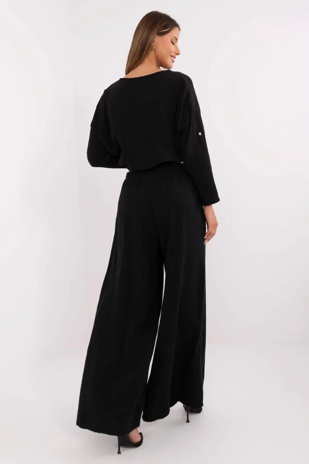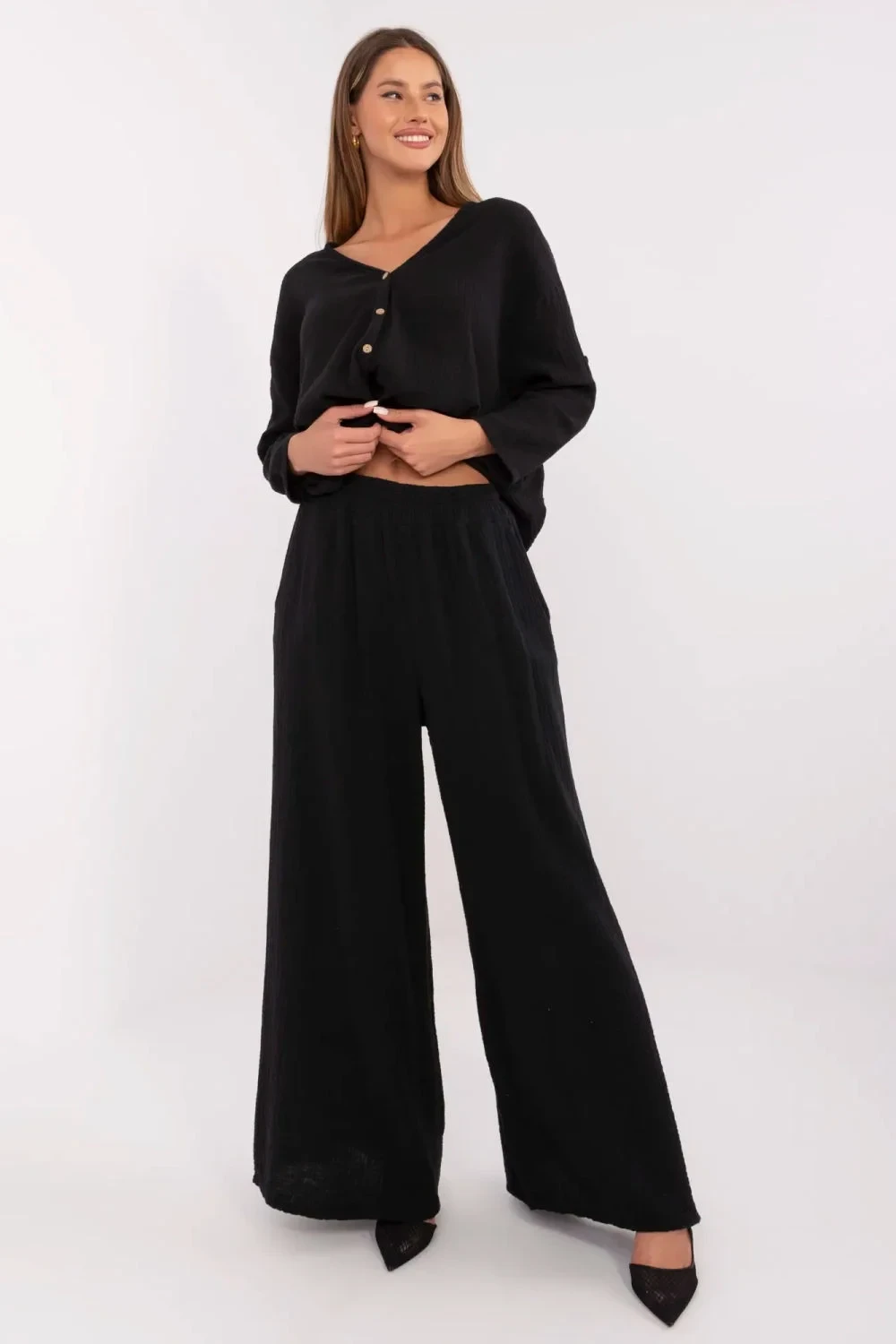 Lehké a stylové dámské kalhoty z mušelínu jsou ideální volbou na teplé dny. Vyrobené z prodyšné bavlny, zaručují pohodlí a přirozenou volnost pohybu. Střih palazzo s širokými nohavicemi jim dodává elegantní a zároveň ležérní charakter, ideální na každý den. Elastický pásek zajistí pohodlné přizpůsobení, zdůrazňující pas a zvyšující pohodlí při nošení. Boční kapsy s přišitím přidávají praktičnost a hladký vzor z nich dělá univerzální a snadno stylizovatelné kalhoty. Skvěle ladí jak s přiléhavým topem, tak s volnější košilí, vytvářejí lehké a módní sestavy na různé příležitosti.