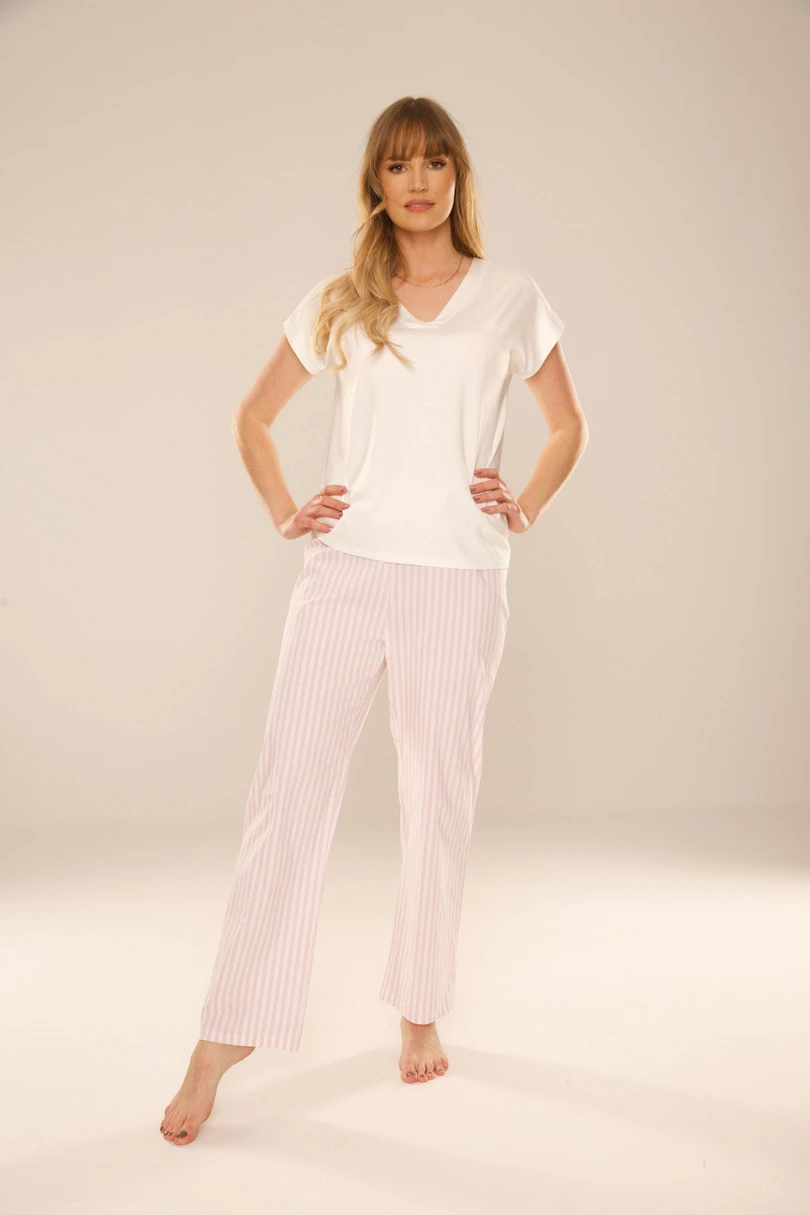 Damskie spodnie TAYLOR to idealne połączenie komfortu i modnego wyglądu. Wykonane z miękkiej mieszanki bawełny (70%), poliestru (27%) i elastanu (3%), są przyjemne w dotyku, przewiewne i delikatnie elastyczne, co zapewnia doskonałe dopasowanie do sylwetki. Klasyczny wzór w paski dodaje im stylowego charakteru, a elastyczna guma w pasie i proste nogawki gwarantują pełną swobodę ruchów. Świetnie sprawdzą się zarówno jako piżama, jak i wygodne spodnie do relaksu w domowym zaciszu.