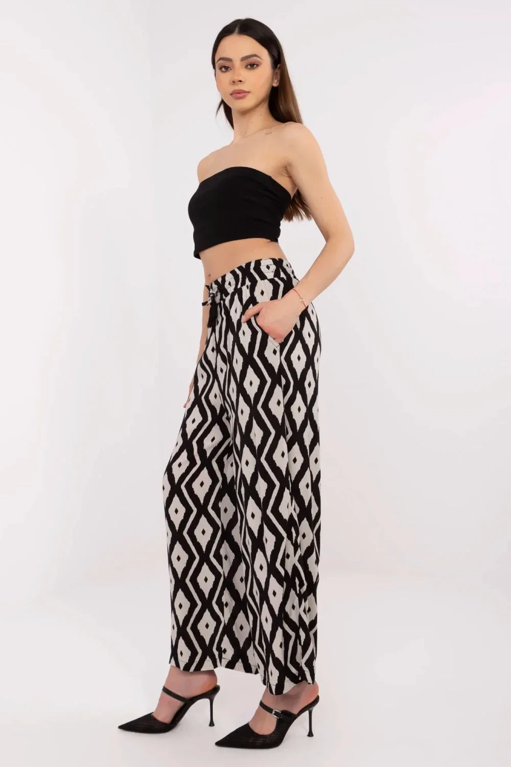 Lehké a pohodlné dámské kalhoty s casualovým charakterem jsou ideální volbou pro každodenní outfit. Vyrobené z prodyšné a šetrné vůči kůži viskózy, která patří do kategorie ekologického oblečení, spojují pohodlí nošení s péčí o životní prostředí. Vysoký pas a šněrování v pase zajistí skvělé padnutí a zdůrazní pas, zatímco široké nohavice dodají postavě lehkost. Ozdobný potisk přidává charakter a boční kapsy zvyšují funkčnost. Jedná se o skvělý návrh pro ženy, které ocení styl, pohodlí a uvědomělé výběry.
