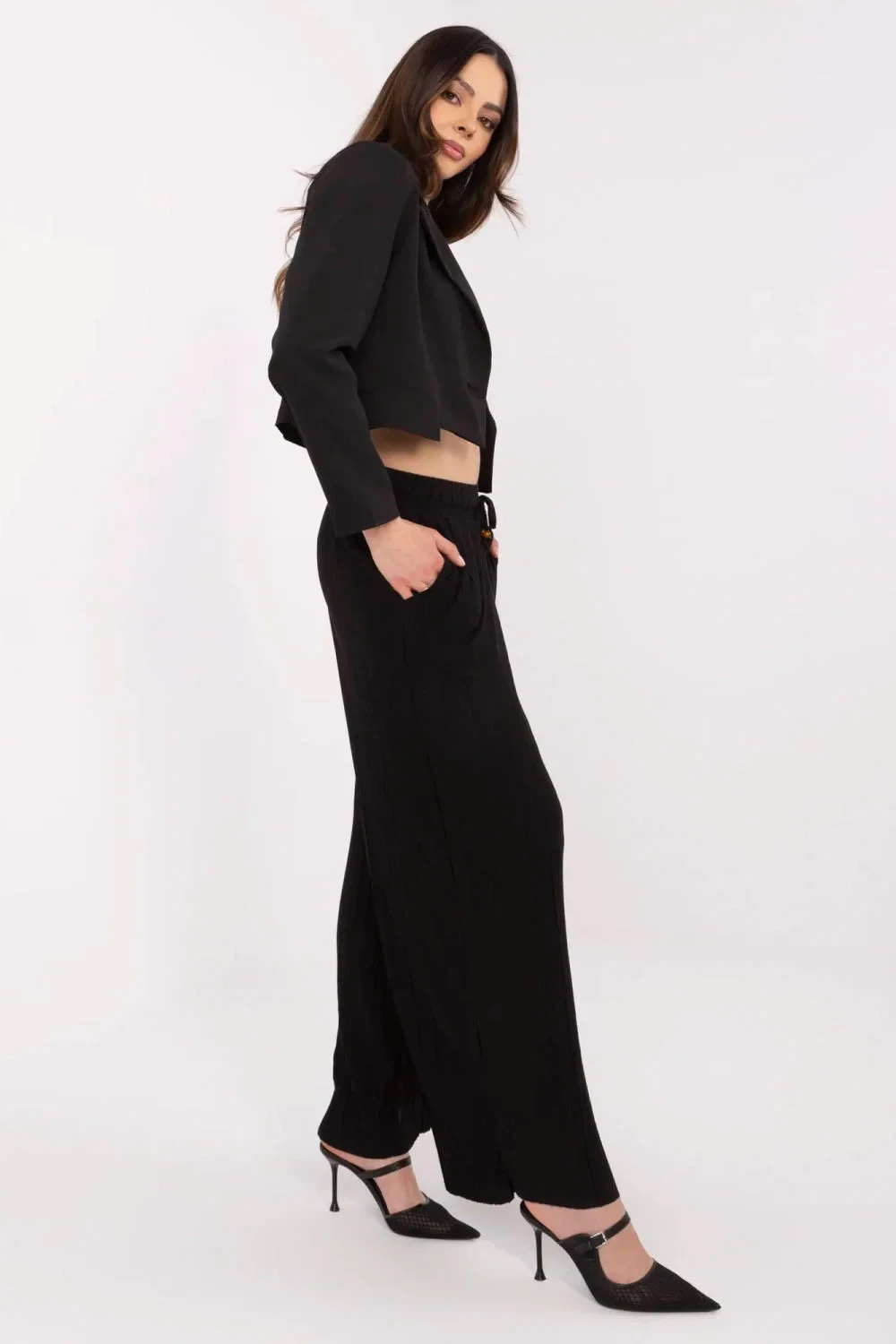 Tyto volné kalhoty jsou kombinací pohodlí a moderního stylu. Vyrobené z měkké směsi viskózy a polyesteru, skvěle padnou na postavu a poskytují pohodlí po celý den. Hladký materiál a klasický střih dělají z kalhot ideální volbu pro každodenní stylování, ať už do práce, na procházku nebo setkání s přáteli. Vysoký pas a šněrování v pase hezky zdůrazňují pas, zatímco široké nohavice dodávají lehkost a volnost pohybu. Praktické boční kapsy doplňují funkční charakter tohoto modelu.