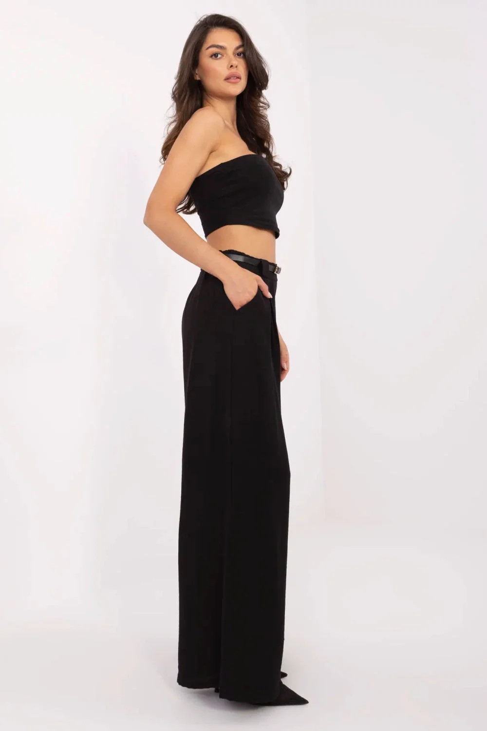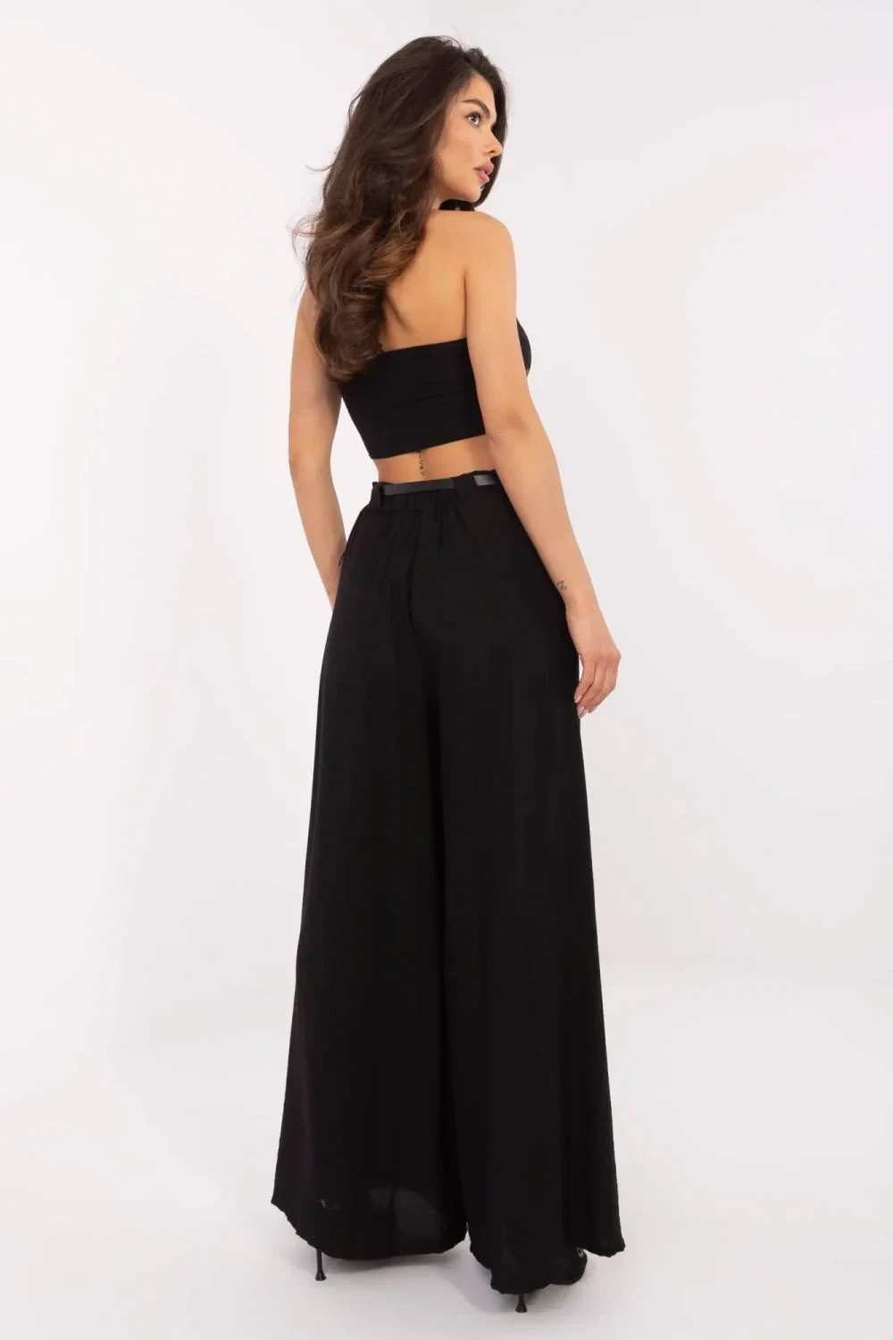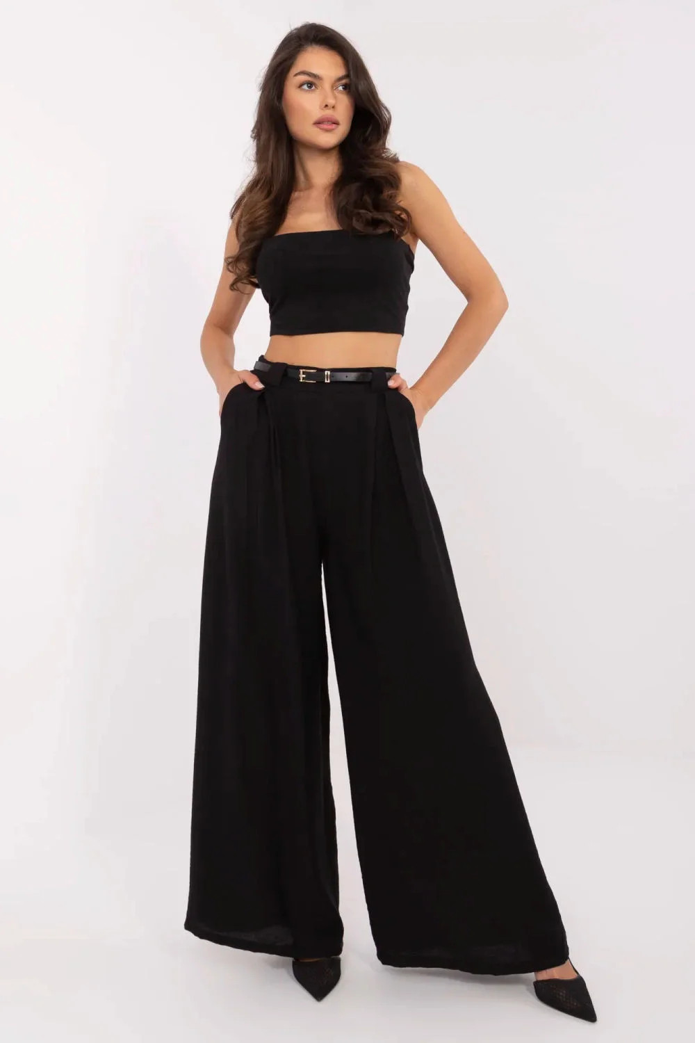 Stylové materiálové dámské kalhoty typu palazzo jsou ideální volbou na každý den i do práce. Vyrobené z lehké a příjemné směsi viskózy a nylonu poskytují pohodlí nošení a volný, elegantní vzhled. Model s hladkou strukturou a širokými nohavicemi vypadá mimořádně lehce a moderně. Vysoký pas s elastickou gumou vsazenou vzadu se skvěle přizpůsobuje postavě, zdůrazňuje pas a zajistí pohodlí po celý den. Kalhoty nemají klasické zapínání, což dále zvyšuje pohodlí používání, a součástí je zapínací pásek, který zdůrazní pas a dodá celku elegantní dokončení. Boční kapsy zvyšují jejich praktičnost.
