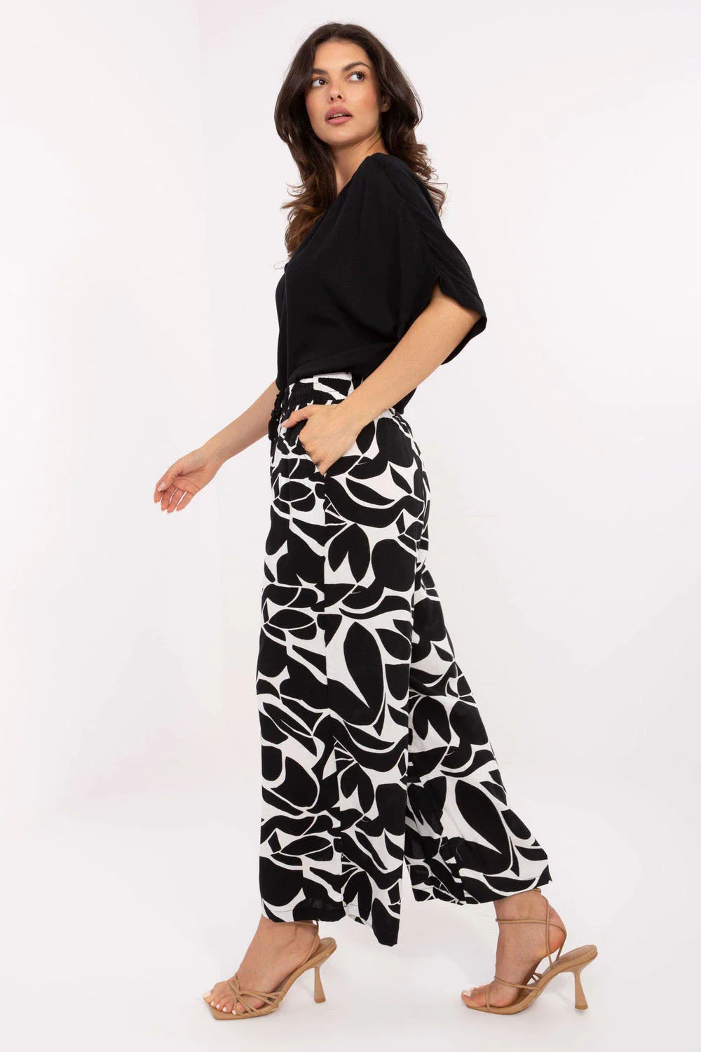 Lehké a pohodlné dámské kalhoty s casualovým charakterem jsou ideální volbou pro každodenní outfit. Vyrobené z prodyšné viskózy přátelské k pokožce, která patří do kategorie ekologického oblečení, spojují pohodlí nošení s péčí o životní prostředí. Vysoký pas a vázání v pase zajistí skvělé přizpůsobení a zdůrazní pas, zatímco široké nohavice dodají postavě lehkost. Dekorativní potisk dodává charakter a boční kapsy zvyšují funkčnost. Jedná se o skvělý návrh pro ženy, které ocení styl, pohodlí a uvědomělé výběry.