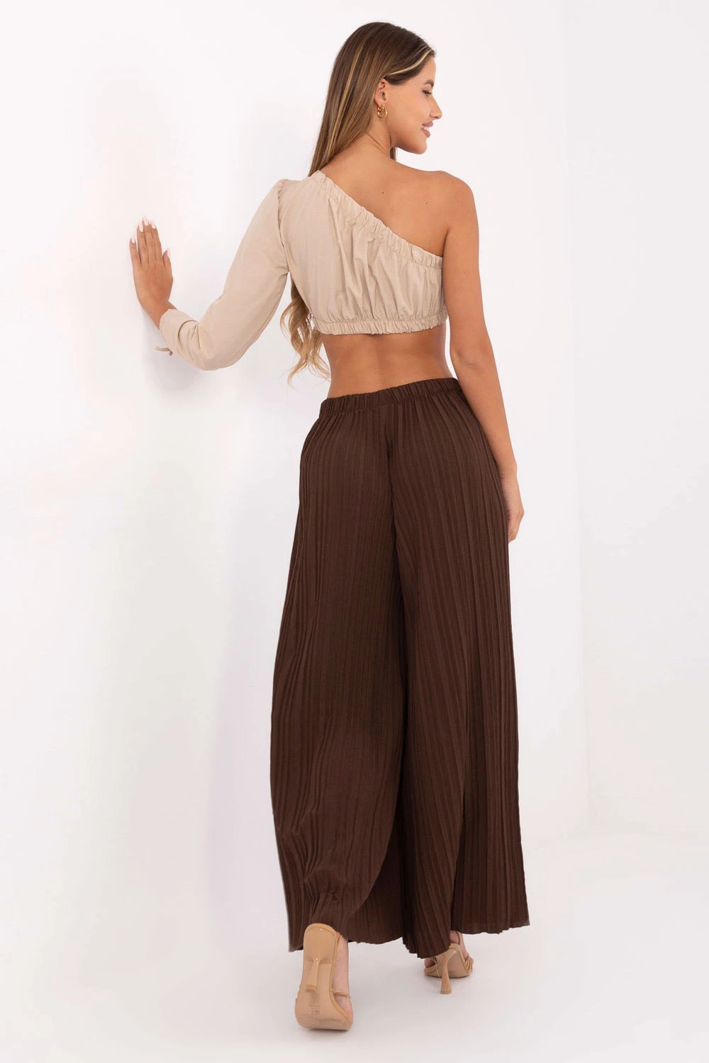 Pohodlné a stylové dámske nohavice z textílie s štruktúrou sú must-have v každodennej garderóbe. Ich neformálny charakter v kombinácii s minimalistickým dizajnom je skvelou voľbou nielen na prechádzku, nákupy, ale aj do práce v uvoľnenejšom štýle. Model s vysokým pásom, bez zapínania, s elastickým pásom zabezpečuje ideálne priliehanie a pohodlie počas celého dňa. Hladká, jemne štruktúrovaná textília z polyesteru sa krásne kladie a široké nohavice opticky predlžujú nohy a dodávajú postave ľahkosť. Nohavice nemajú vrecká, čo zdôrazňuje ich jednoduchý, moderný tvar. Sú to univerzálny kúsok garderóby, ktorý ľahko skombinujete nielen s tričkom, ale aj s elegantnou košeľou.