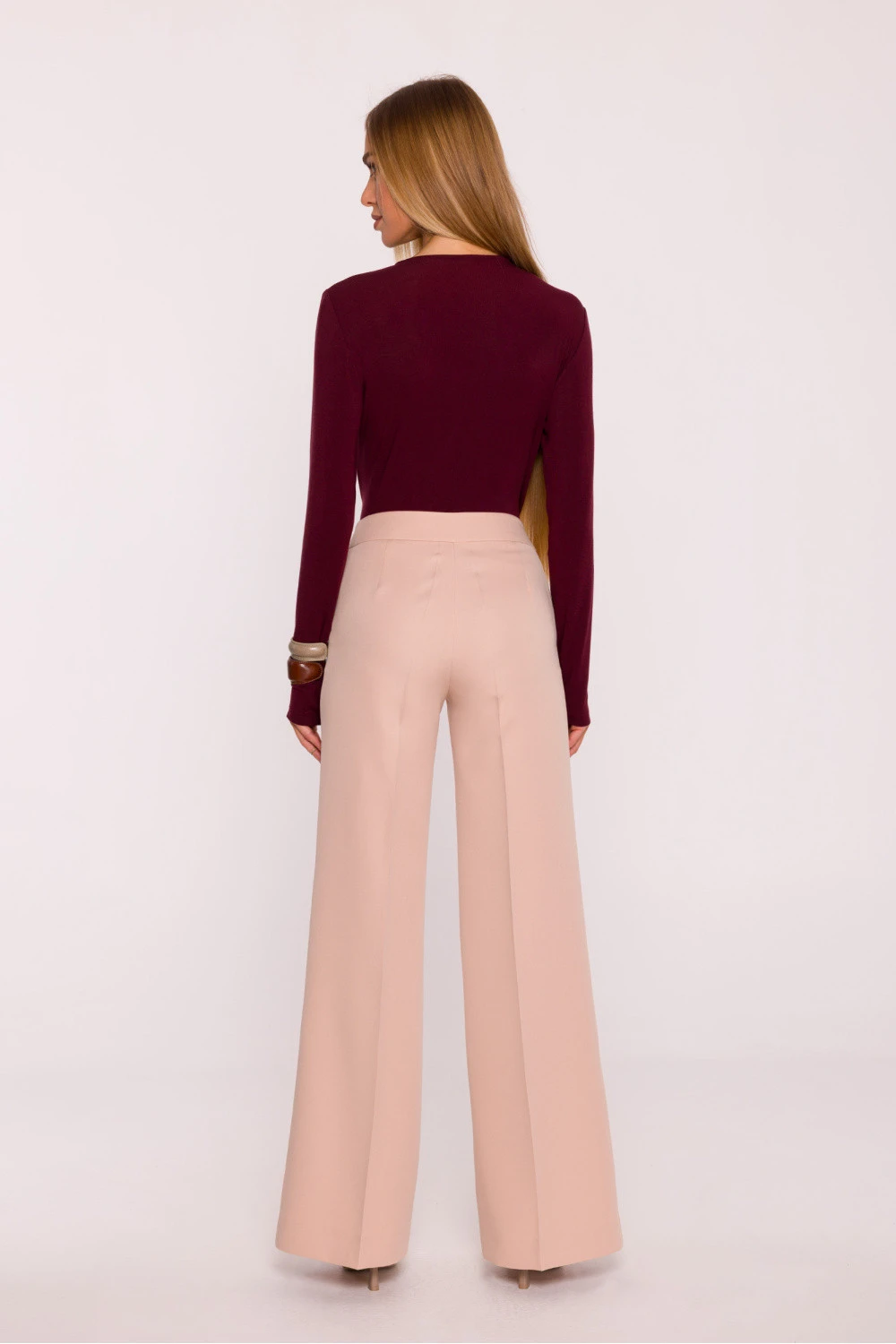 Klasické dámské kalhoty vyrobené z hladkého oblekového materiálu s matným povrchem jsou elegantní a nadčasovou volbou pro různé styly. Materiál si udržuje strukturu a vytáhlé nohavice dodávají celku sofistikovaný charakter. Model s středním pasem se přizpůsobí pasu a bokům, zatímco široké nohavice od stehna dolů zajišťují pohodlí a volnost pohybu. Zapínání na knoflík a skrytý zip vpředu zaručuje pohodlí, zatímco boční kapsy dodávají funkčnost. Kalhoty sahají až na zem, co spolu se širokými nohavicemi opticky prodlužuje postavu a zdůrazňuje elegantní charakter celého outfitu. Bez podšívky zůstává model lehký a pohodlný na nošení. Navrženo a ušito v Polsku pro ženy, které ocení klasiku, pohodlí a dokonalé provedení.
