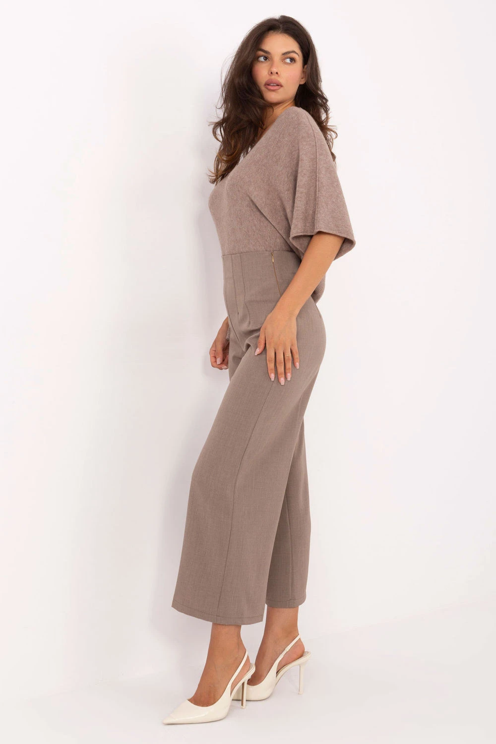 Elegantní kalhoty typu culottes pro ženy jsou nabídkou, která spojuje styl a pohodlí. Vyrobené z vysoce kvalitního polyesteru s přídavkem elastanu jsou hladké, lehké a pohodlné na nošení. Model s vysokým pasem krásně zdůrazňuje pas, zatímco široké nohavice dodávají postavě lehkost a moderní charakter. Kalhoty se zapínají na skrytý zip umístěný na levé straně, což zaručuje estetické provedení. Chybějící kapsy zdůrazňují elegantní, minimalistický styl. Ideální jak do práce, tak na společenské události, nadčasové kalhoty typu culottes, které se hodí do mnoha outfitů.
