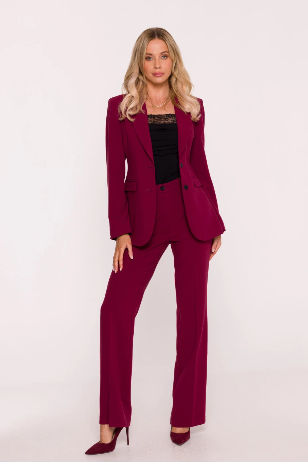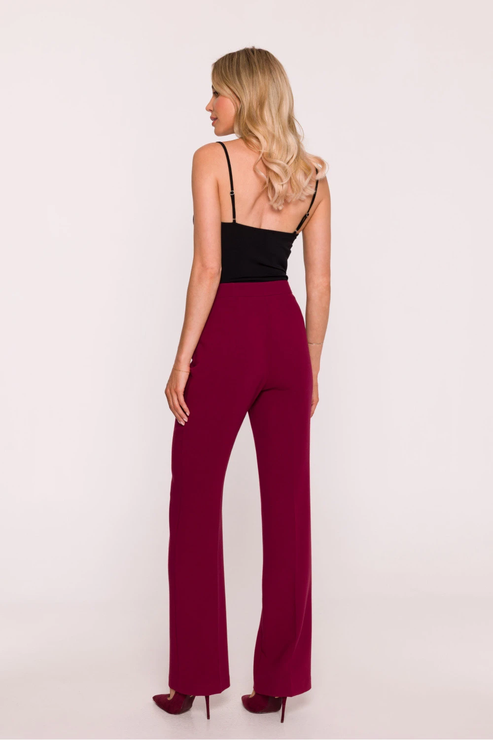 Klasické dámské kalhoty vyrobené z hladké látky s jemným povrchem. Střih oblečení, přizpůsobený v pasu a bocích, s rovnými, dlouhými nohavicemi s olovnatými záhyby, které zúžují postavu a dodávají eleganci. Model má střední výšku pasu a praktické boční kapsy. Zapínání vpředu na knoflík a skrytý zip zaručuje pohodlí a estetické provedení. Chybějící podšívka zajišťuje, že kalhoty jsou lehké a pohodlné na nošení. Nadčasový střih se hodí jak do firemních stylizací, tak do formálnějších outfitů. Navrženo a ušito v Polsku.