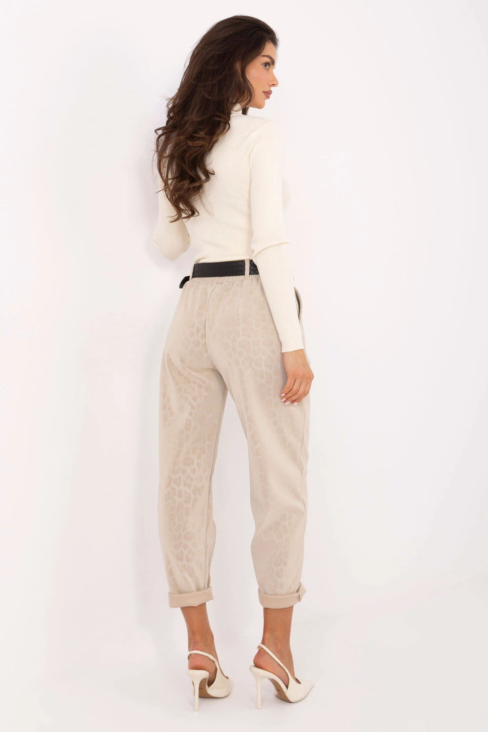 Dámské kalhoty z ekokože v casual stylu, ideální na každý den. Vyrobené z směsi viskózy, nylonu a elastanu, spojují pohodlí nošení s pružností a odolností. Model s vysokým pasem, se zužujícími se nohavicemi a gumou v pasu poskytuje pohodlí a efektní, přiléhavý střih, zatímco přezka zdůrazňuje pas. Boční kapsy a módní motiv leopardího vzoru dodávají kalhotám výrazný, moderní charakter.
