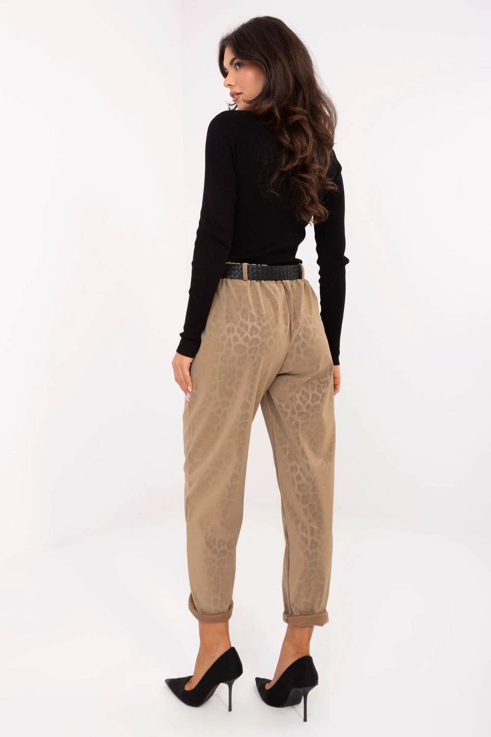 Dámské kalhoty z ekokože v casual stylu, ideální na každý den. Vyrobené z směsi viskózy, nylonu a elastanu, spojují pohodlí nošení s pružností a odolností. Model s vysokým pasem, sešněrovanými nohavicemi a elastickým pásem poskytuje pohodlí a efektní, přizpůsobený střih, a zapínací pásek zdůrazňuje pas. Boční kapsy a módní motiv panterky dodávají kalhotám výrazný, moderní charakter.