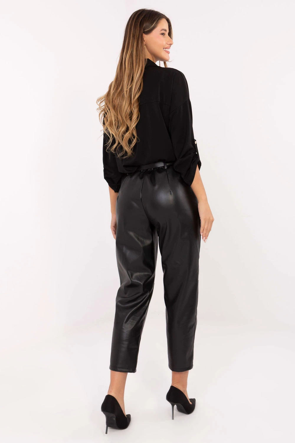 Stylové a pohodlné dámské kalhoty z ekokože jsou ideální volbou pro ženy, které ocení spojení elegance a pohodlí. Model bez zapínání s gumou na pasu vzadu se skvěle přizpůsobí postavě a usnadní oblékání. Vysoký pas jemně zdůrazní pas, zúžené nohavice dodají celku moderní, ženský charakter. Kalhoty jsou vyrobeny z měkké ekokože (kombinace polyesteru a polyuretanu), co zaručuje trvanlivost, pohodlí a efektní vzhled. Boční kapsy pro větší funkcionalitu a zapínací pásek pro individuální přizpůsobení v pase. Díky podšívce s izolací se kalhoty hodí i na chladnější dny. Jejich hladký vzor a ležérní styl je činí skvělou volbou jak do práce, tak na každý den.