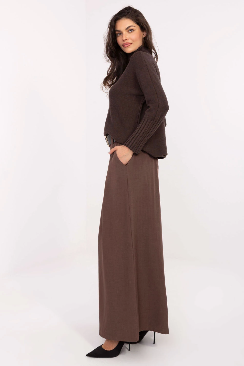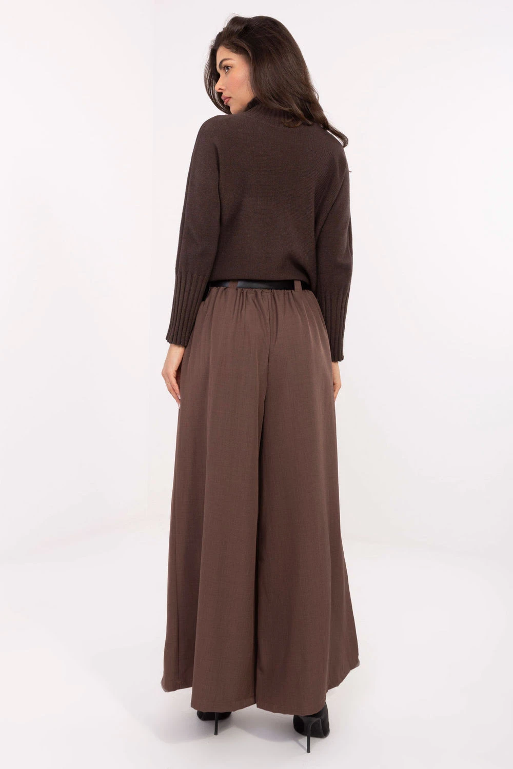 Elegantní a pohodlné dámské kalhoty typu palazzo vyrobené z vysoce kvalitní směsi viskózy a polyesteru, které spojují eleganci s pohodlím nošení každý den i do práce. Hladký materiál dodává kalhotám klasický, rafinovaný charakter a dlouhé, široké nohavice opticky prodlužují postavu, vytvářejí lehký a ženský vzhled. Model má vysoký pas s všitým elastickým pásem pro dokonalé přizpůsobení a záhyby na přední straně, které jemně zdůrazňují pas. Další výhodou je zapínací pásek, který umožňuje přizpůsobit kalhoty postavě a přidat stylizaci rafinovaný akcent. Jedná se o univerzální návrh, který se skvěle hodí jak do každodenních, volnočasových outfitů, tak do výrazných, elegantních stylizací do práce nebo na speciální události.