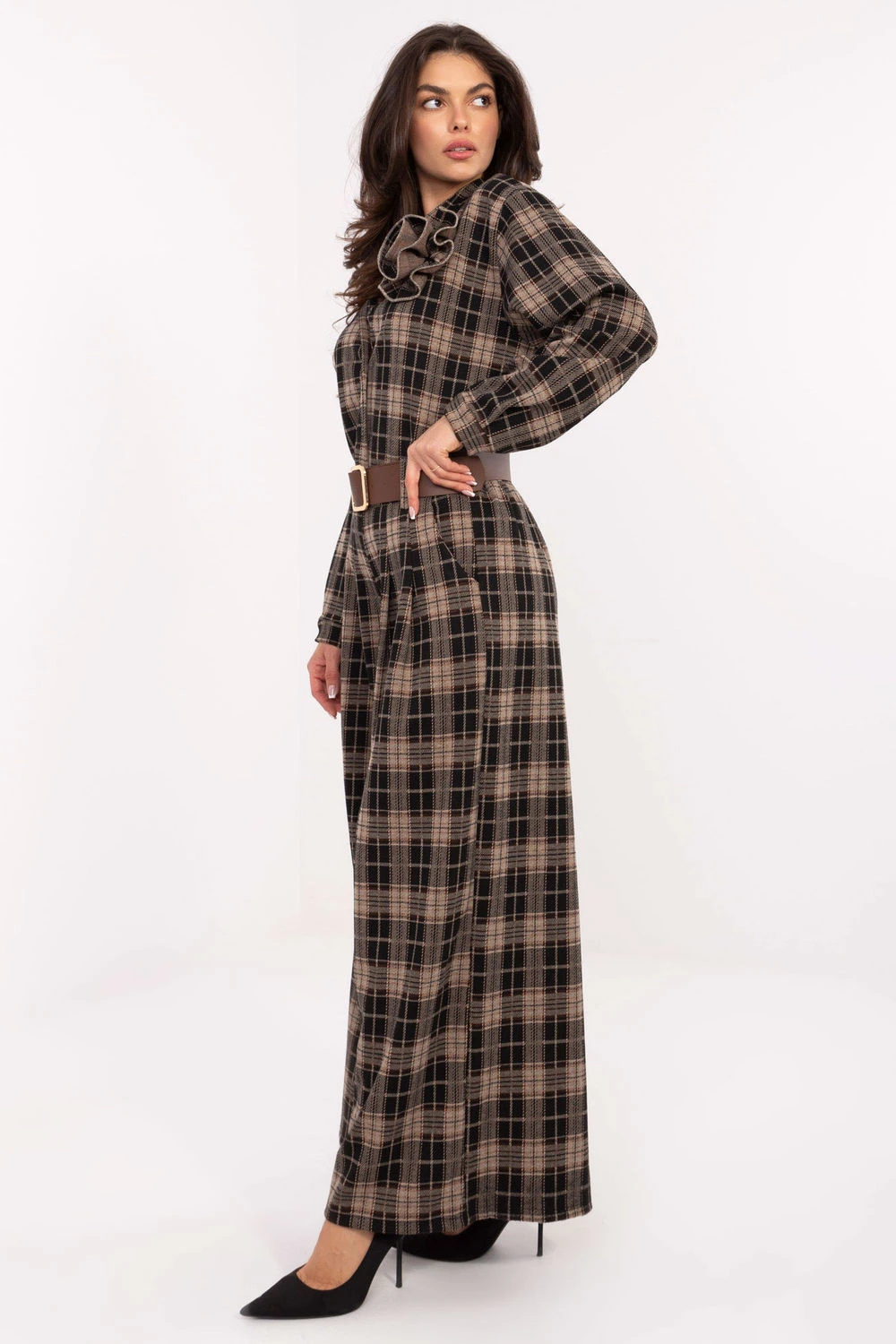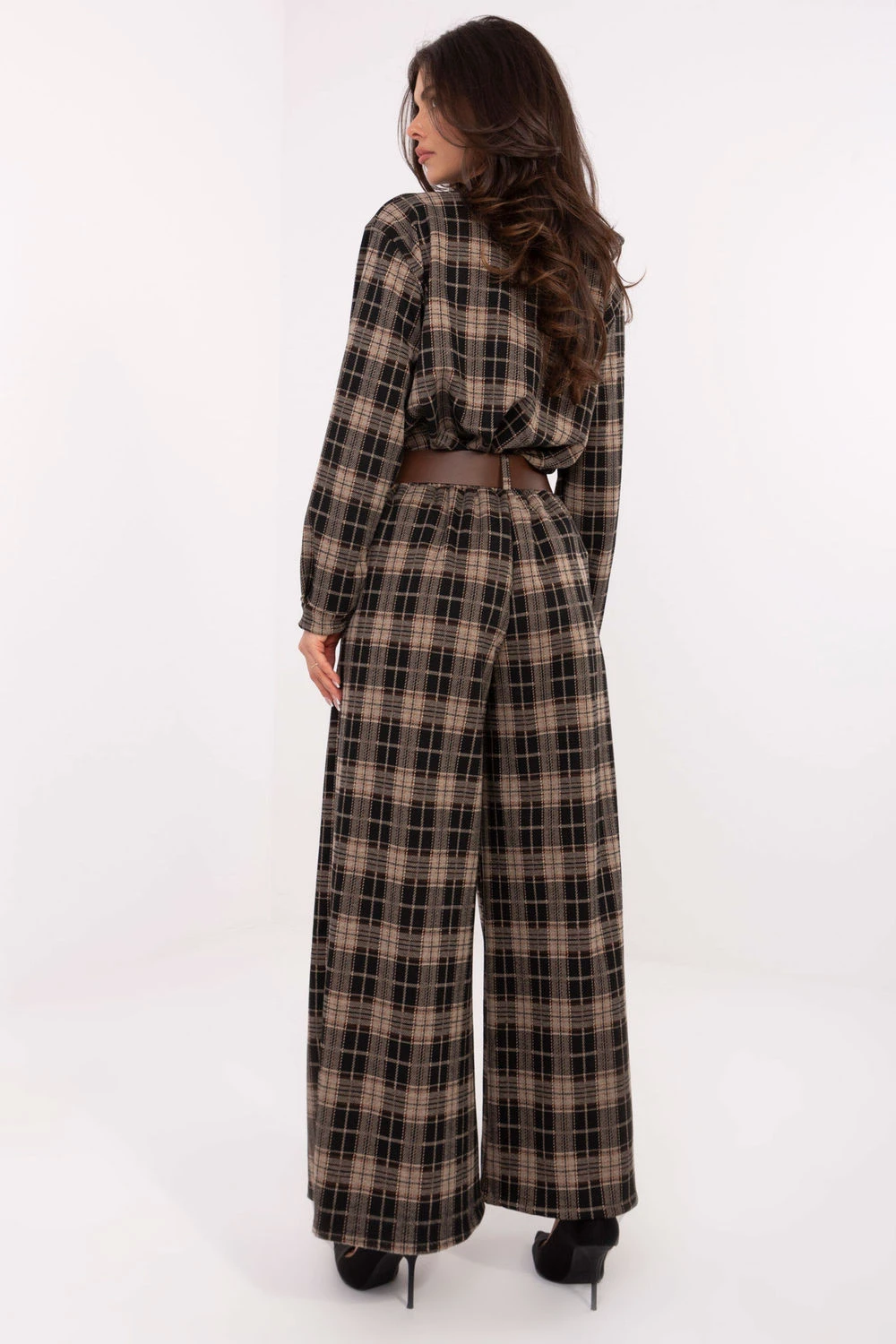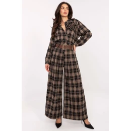 Moderní a pohodlné dámské flanelové kalhoty typu palazzo s casual charakterem, ideální pro každodenní stylizace. Vyrobené z vysoce kvalitní směsi polyesteru, viskózy a elastanu, poskytují pohodlí, lehkost a jemnou pružnost, díky čemuž se skvěle přizpůsobují postavě. Model má vysoký pas a široké nohavice typu palazzo, které opticky prodlužují nohy a dodávají postavě lehkost. Boční kapsy na zip a zapínací pás dodávají praktičnost a umožňují zdůraznit pas. Kalhoty mají kostkovaný vzor, který přináší klasický, nadčasový akcent, a absence zapínání zajišťuje, že jsou mimořádně pohodlné a snadné na použití. Jedná se o univerzální model, který se skvěle hodí jak do každodenních, casual stylizací, tak do elegantnějších outfitů do práce.
